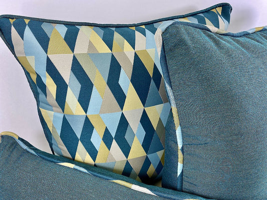 All of our outdoor pillows are made in the USA of Sunbrella or equivalent high performance outdoor fabric and filled a with poly insert. We have created unique collections of pillows that have piping in a color of other pillows in the collection to enhance your choices of patterns and solids that coordinate beautifully.