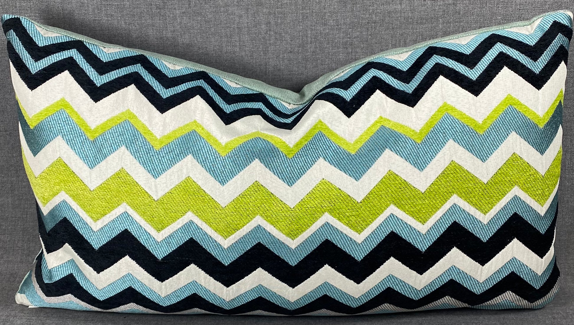 This pillow is 24" x 14" when measured flat with no filling. With filling it is 6" deep. It contains feather and down filling and is made in America. Lime, navy, sky and white chevrons add movement.