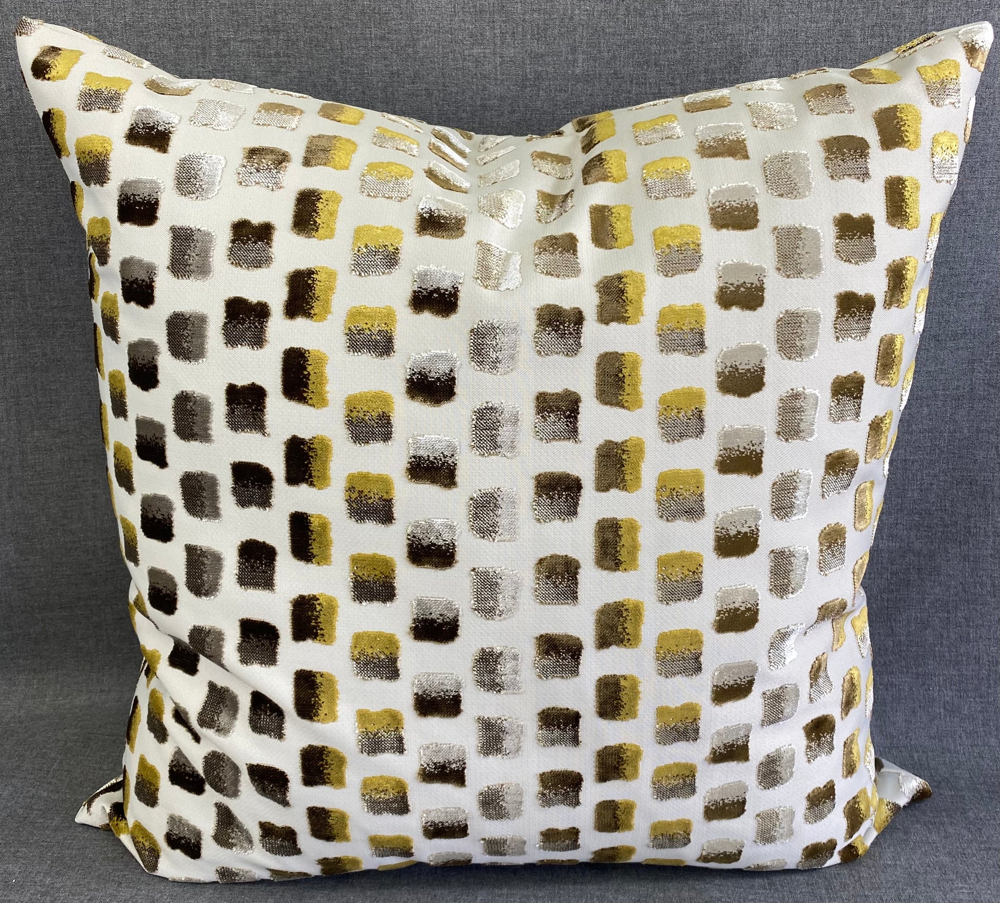 Chartreuse, battleship grey and silver grey tufts on a silver cream base. Simple colors put together well. Movement comes from the way the squares are woven. Of course work it back with any of the colors it has or go for startling contrast by tossing it with purple. You'll be impressed and you can tell everyone it was your idea. I don't mind. This pillow is 24" x 24" when measured flat with no filling. With filling it is 6" deep. It contains feather and down filling and is made in America.