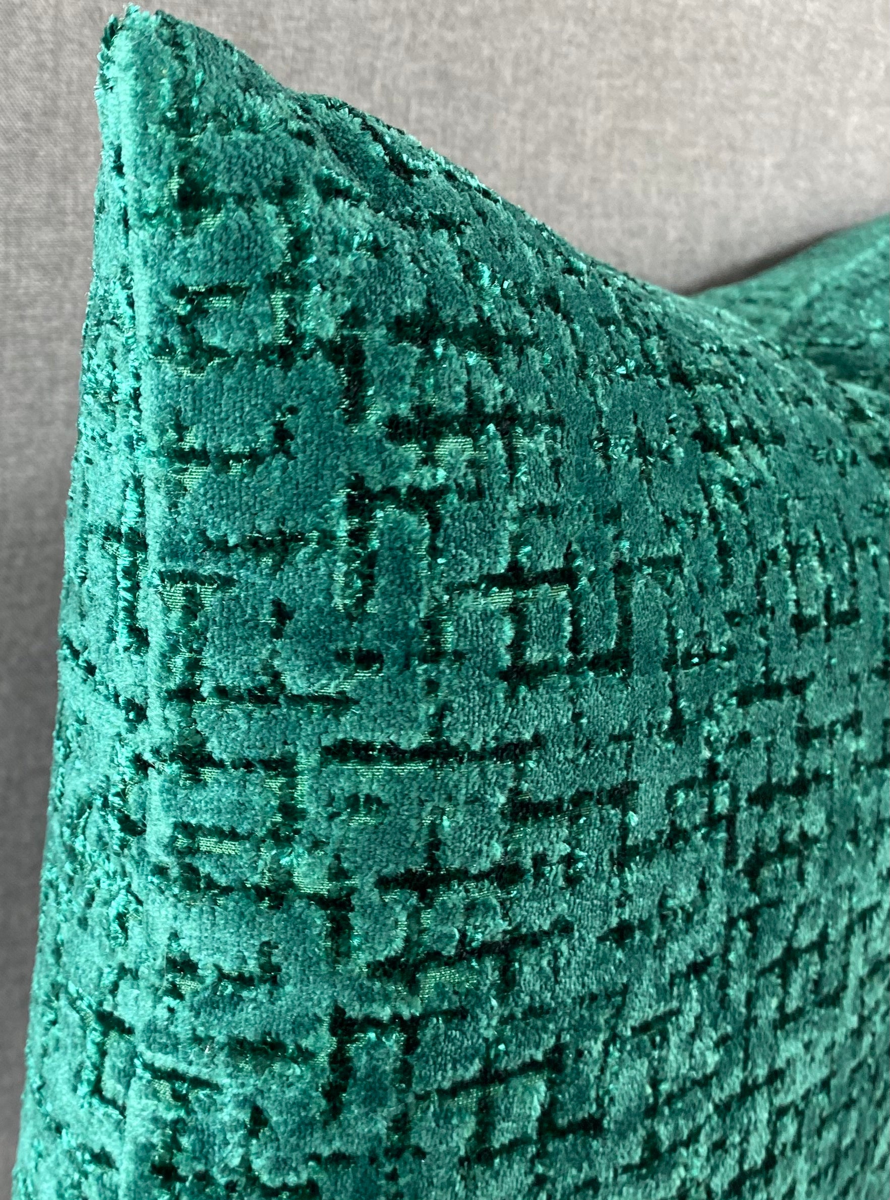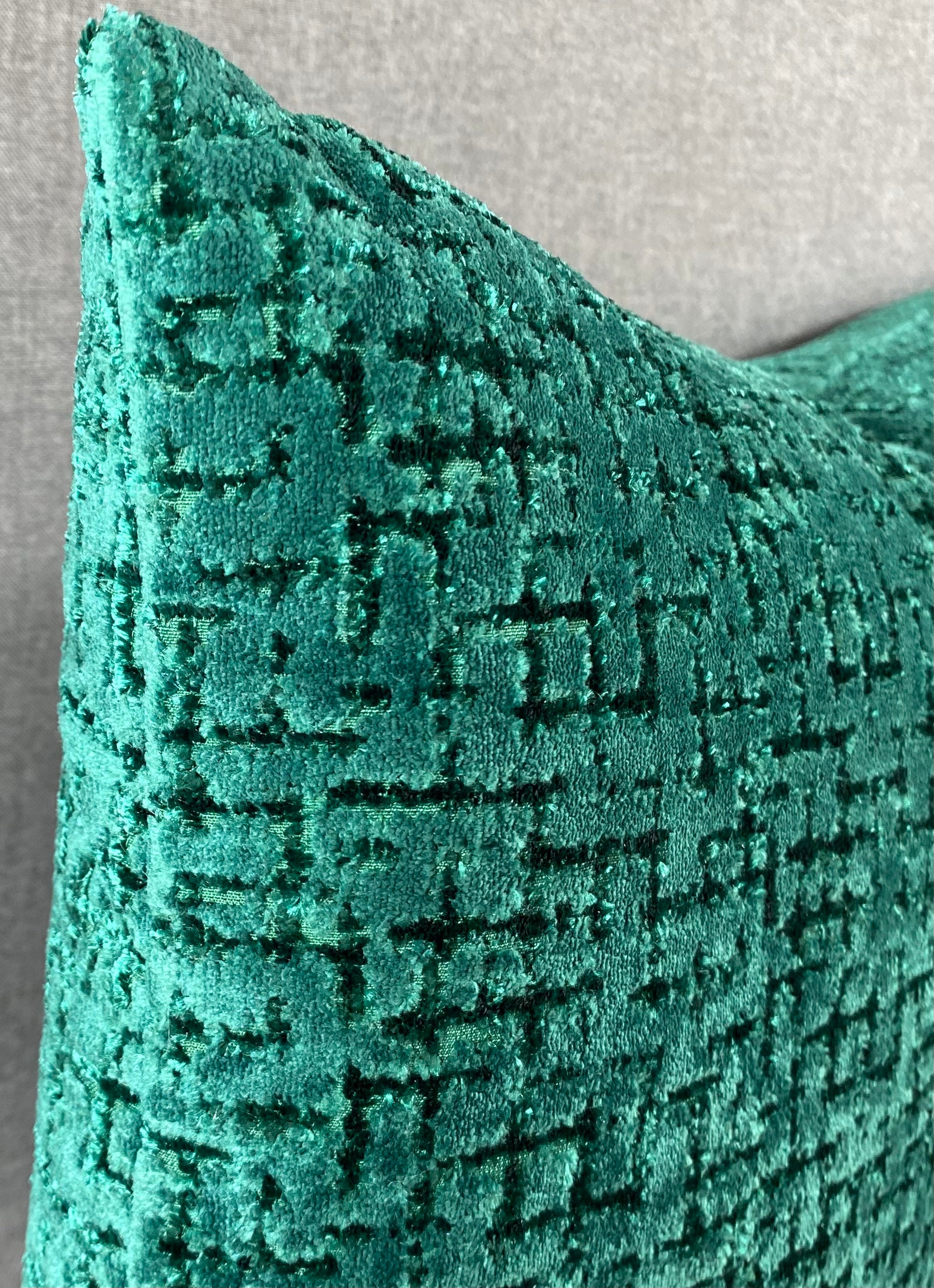 This pillow is 24" x 14" when measured flat with no filling. With filling it is 6" deep. It contains feather and down filling and is made in America. Deep chenille in dark emerald with black hashing.