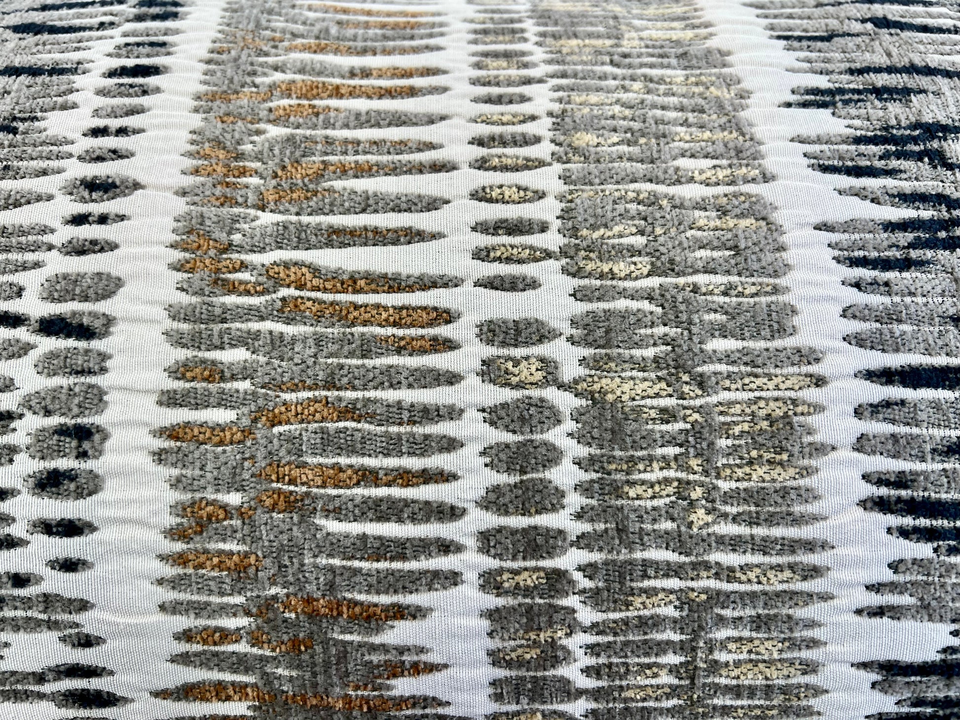 An earthy / tribal vibe that works well with other patterns, black, rust and deep mushroom colors. This pillow is 24" x 14" when measured flat with no filling. With filling it is 6" deep. It contains feather and down filling and is made in America. Chenille stripes of taupe, brown, black & gold on a cream background