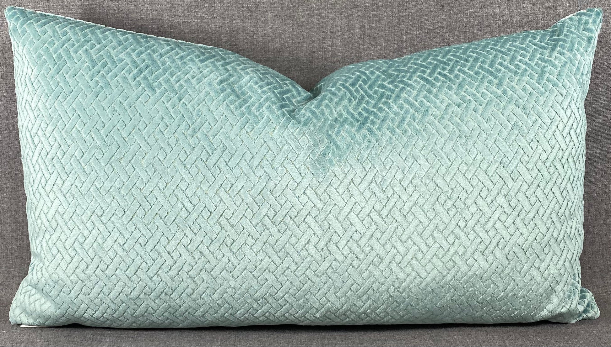 This pillow is 24" x 14" when measured flat with no filling. With filling it is 6" deep. It contains feather and down filling and is made in America. Solid teal chenille in a basketweave jacquard pattern.