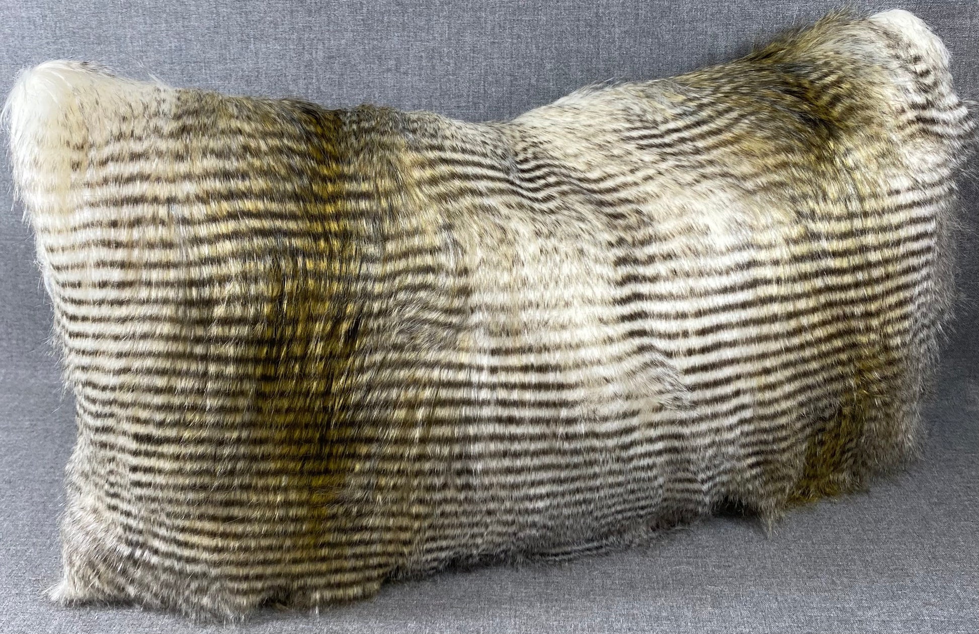 This pillow is 24" x 14" when measured flat with no filling. With filling it is 6" deep. It contains 100% pure down filling and was made in America. Faux Fur.