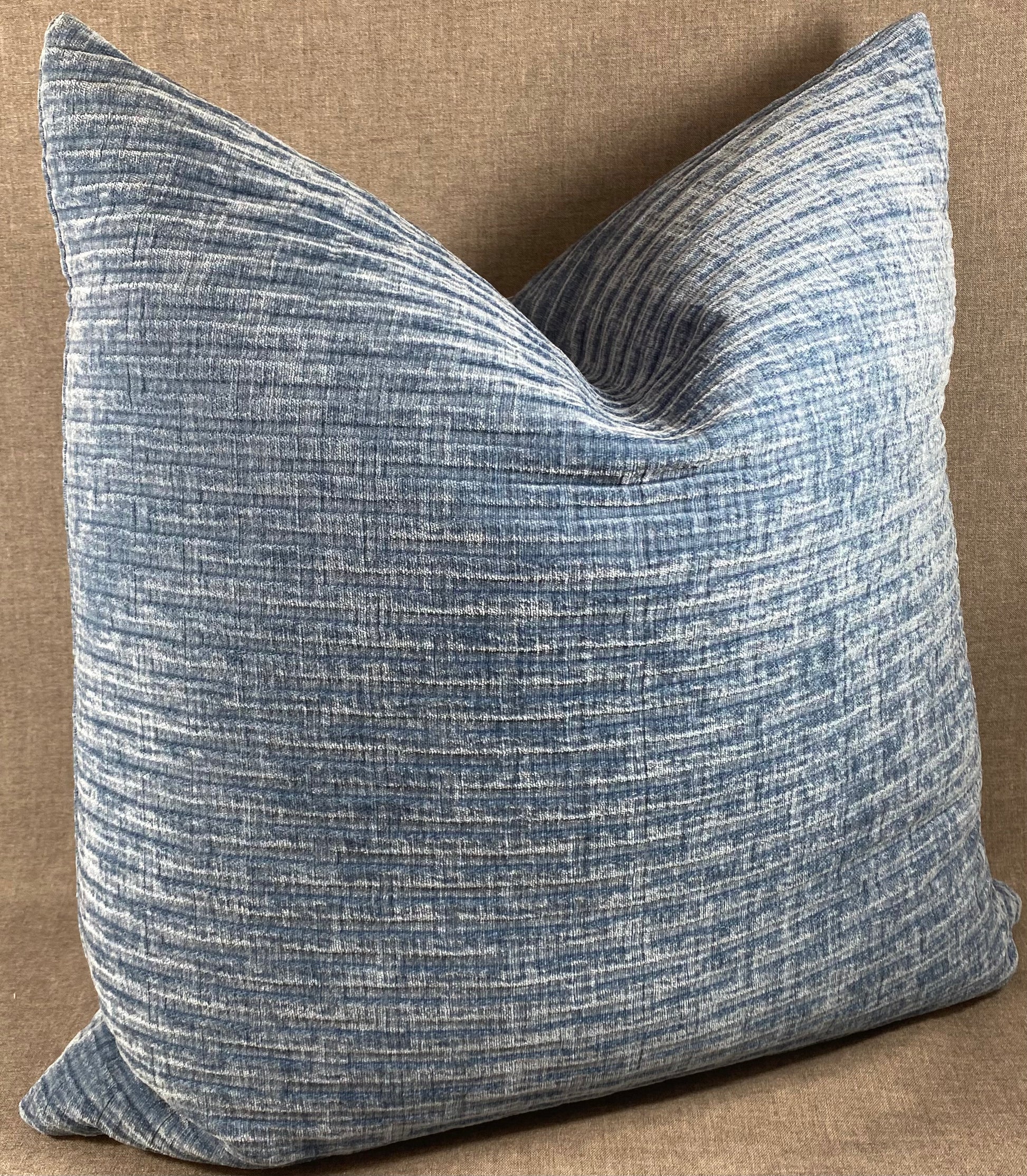 This pillow is 24" x 24" when measured flat with no filling. With filling it is 6" deep. It contains feather and down filling and is made in America. A horizontal striped Denim Blue soft textured fabric.
