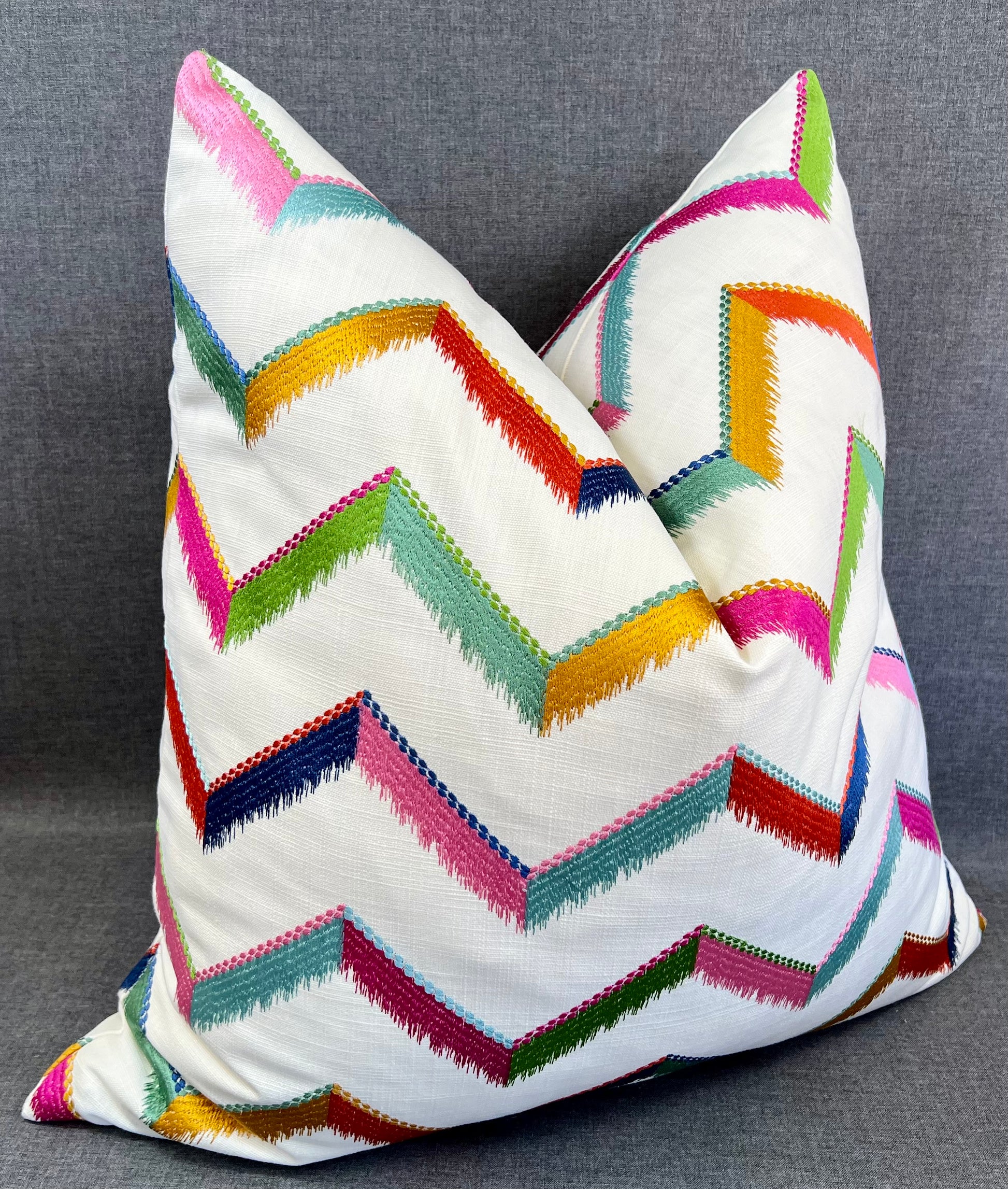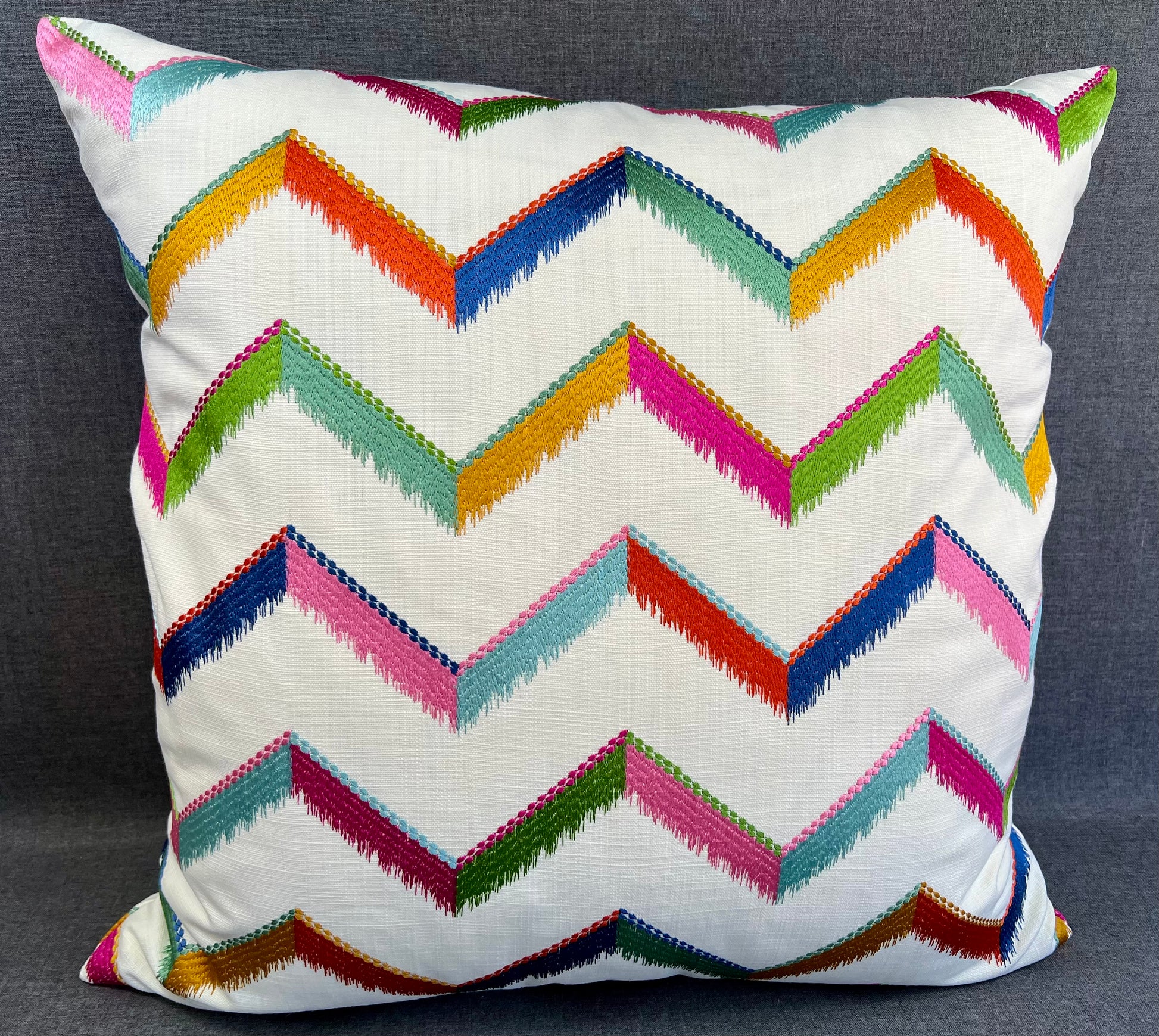 This pillow is 24" x 24" when measured flat with no filling. With filling it is 6" deep. It contains feather and down filling and is made in America. These are limited production runs until the fabric is gone. Bright embroidered chevrons of pinks, greens blues, golds and oranges on a white linen textured background