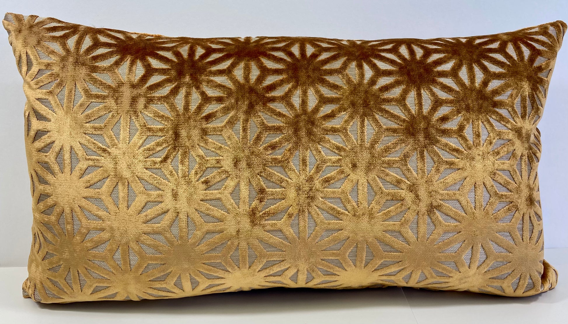 Limited edition. This pillow is 24" x 14" when measured flat with no filling. With filling it is 6" deep. It contains feather and down filling and is made in America. Geometric starbursts of deep burnish gold velvet on a tan base.
