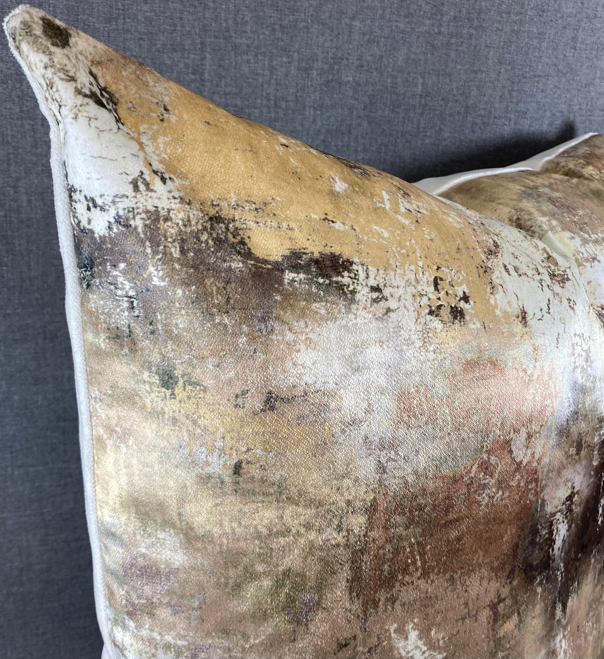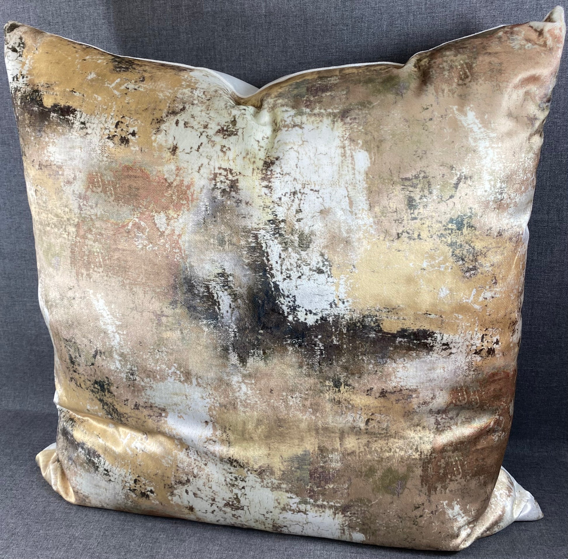 This pillow is 24" x 24" when measured flat with no filling. With filling it is 6" deep. It contains feather and down filling and is made in America. Butter, ivory and dark kakhi scrubbed on a velvet base