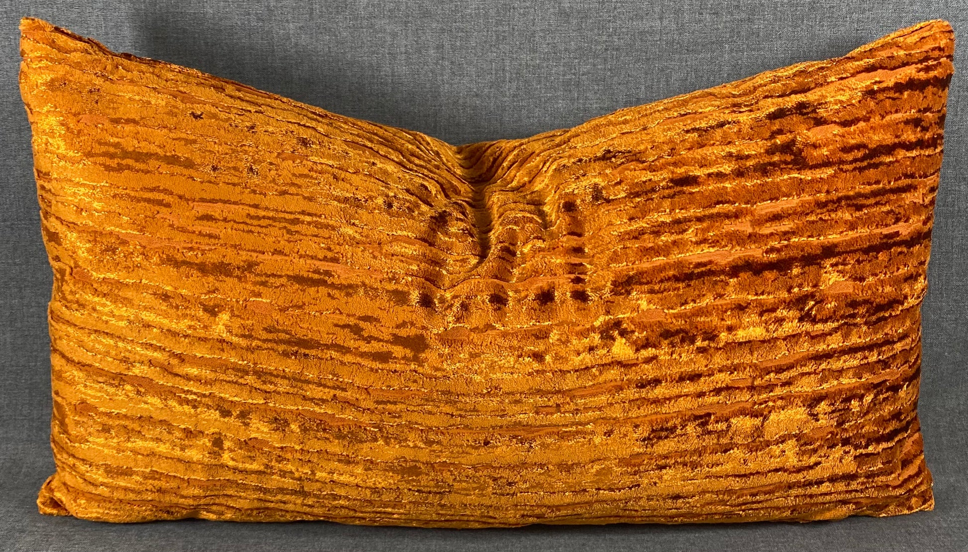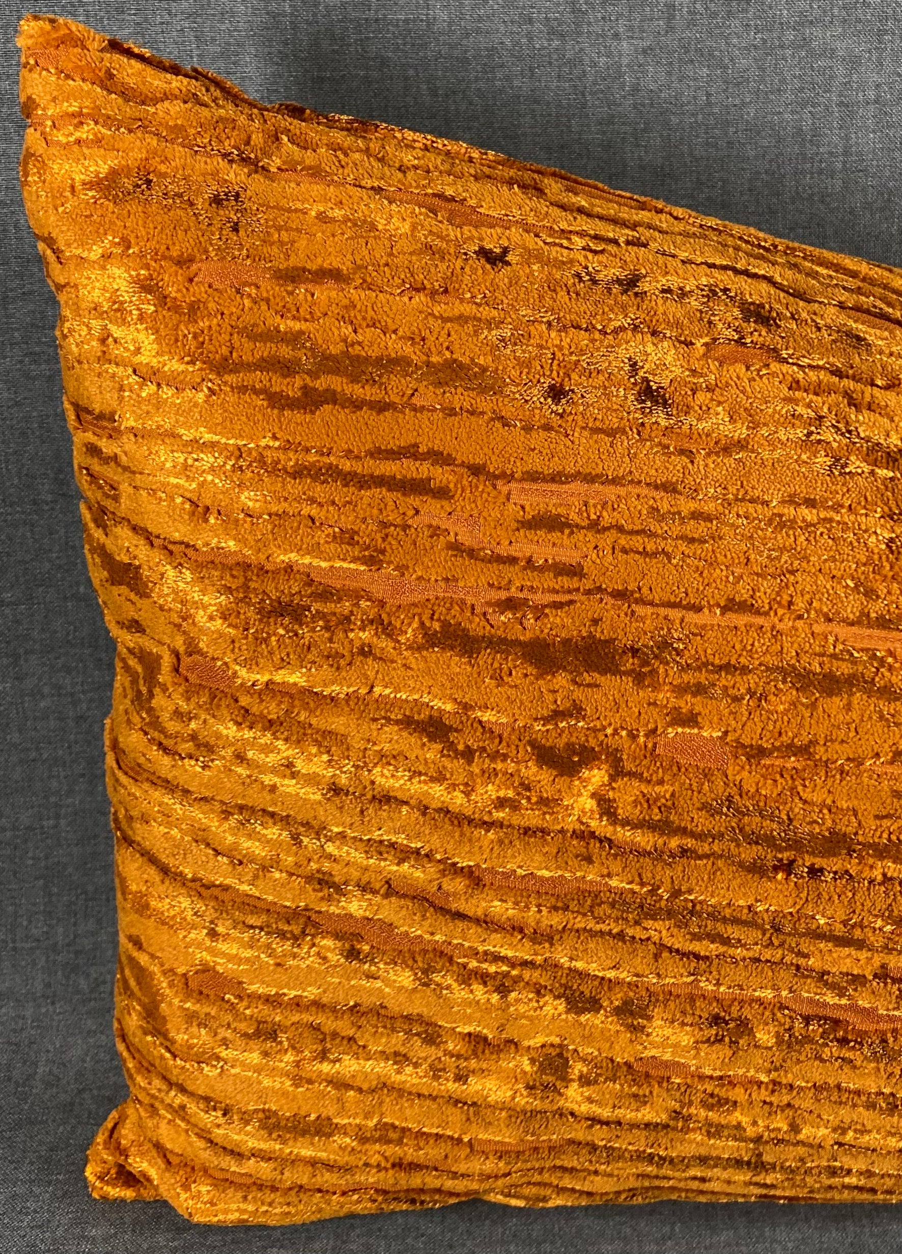 This pillow is 24" x 14" when measured flat with no filling. With filling it is 6" deep. It contains feather and down filling and is made in America. A very soft fabric of burnt orange, catching the light to give depth to the color.