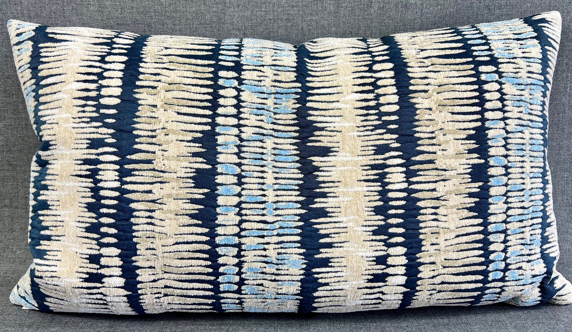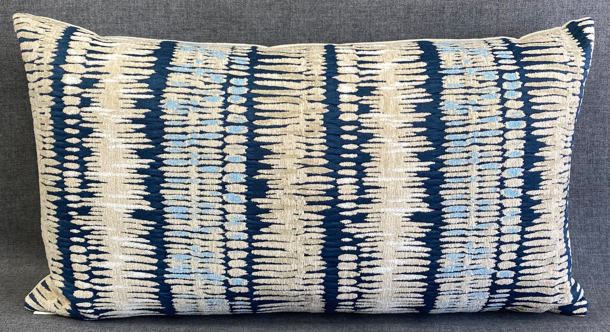 An earthy / tribal vibe that works well with other patterns, blues, tans and solid colors. This pillow is 24" x 14" when measured flat with no filling. With filling it is 6" deep. It contains feather and down filling and is made in America. Chenille stripes of Navy, Pale Blue, Cream & white on a tan background.