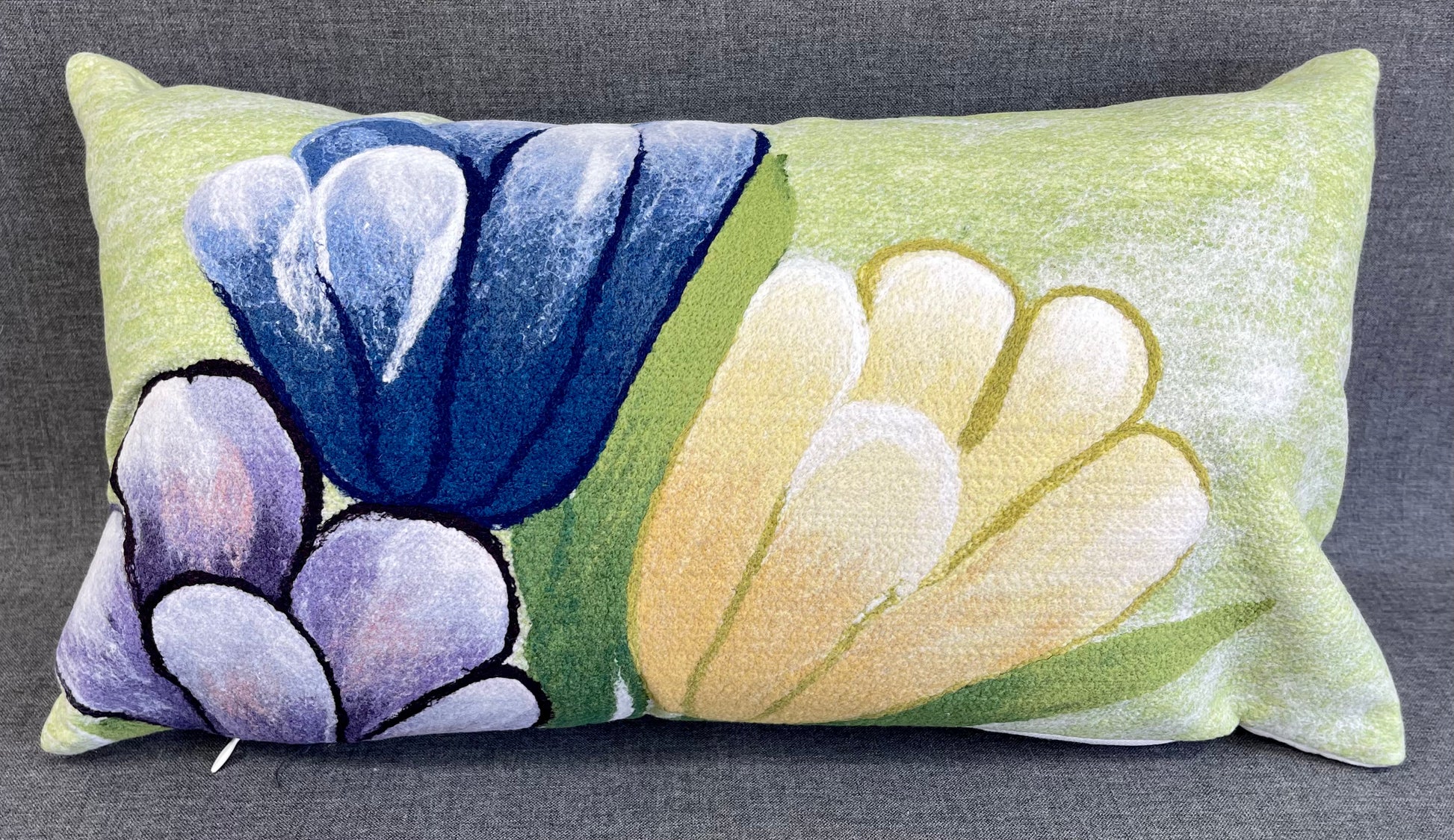 This pillow is 18" x 10" when measured flat with no filling. With filling it is about 5” deep. It contains fiber filling and is made in America. These are limited production runs until the fabric is gone. 3 Large Flowers of Blue, Yellow and Purple on a soft green background.