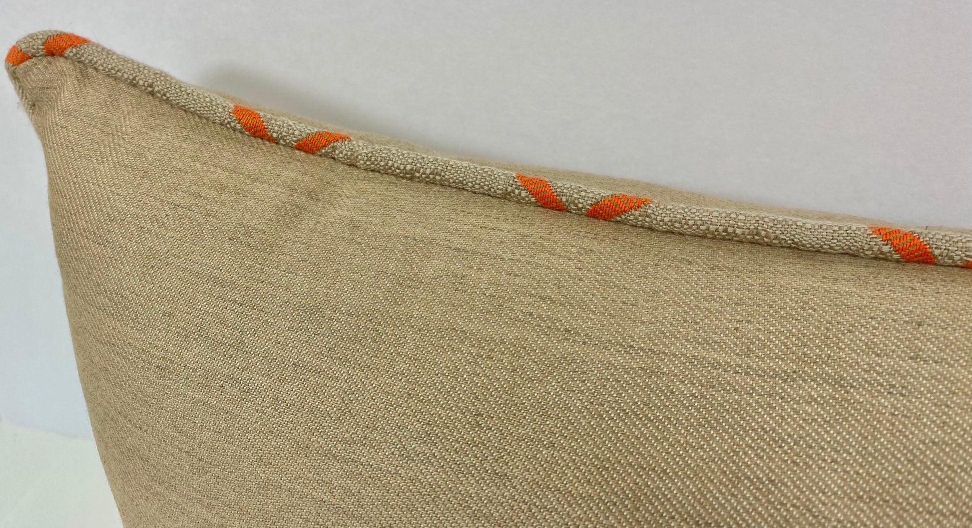 You won't find these pillows any other place since we designed them with the contrast welting to set them apart from standard off the shelf product. We give you the designer look without the price tag. This pillow is 22" x 12" when measured flat with no filling. With filling it is about 5” deep. It contains fiber filling and is made in America. These are limited production runs until the fabric is gone. Sunbrella, or equivalent, with poly fill.