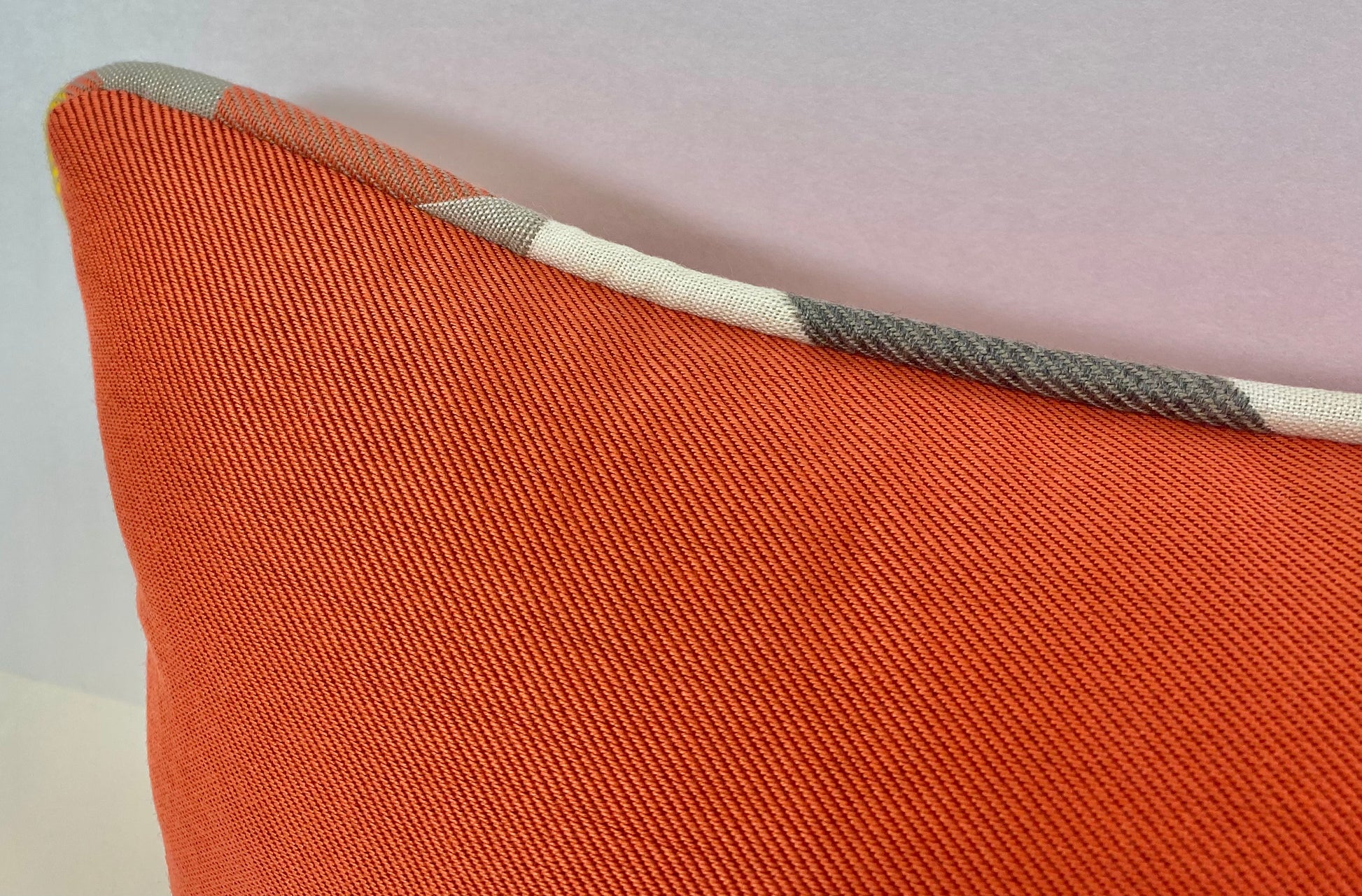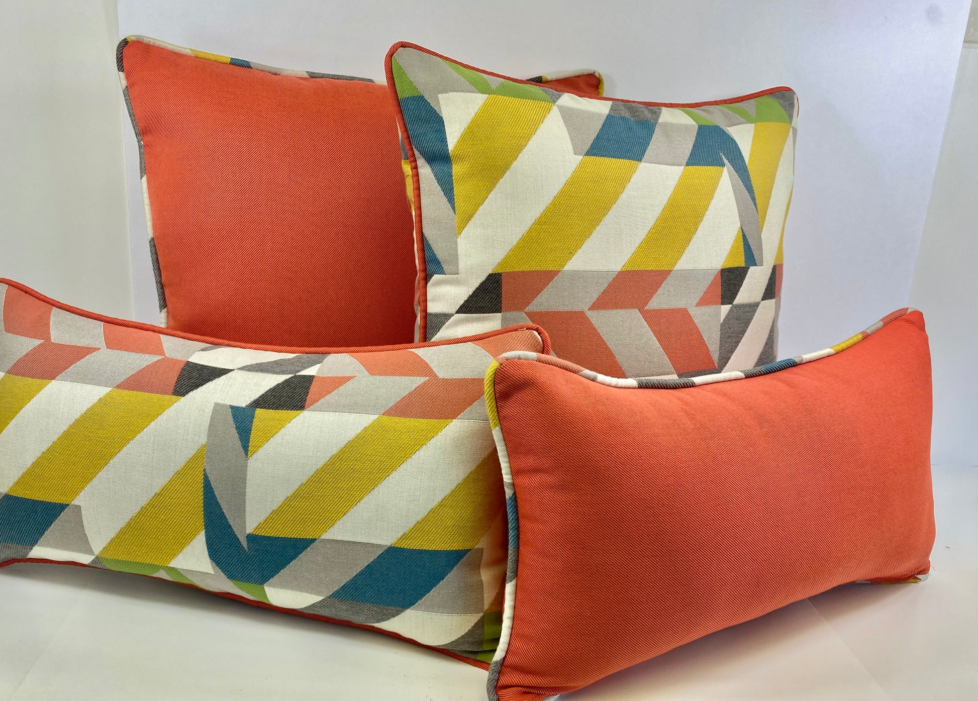You won't find these pillows any other place since we designed them with the contrast welting to set them apart from standard off the shelf product. We give you the designer look without the price tag. This pillow is 22" x 12" when measured flat with no filling. With filling it is about 5” deep. It contains fiber filling and is made in America. These are limited production runs until the fabric is gone.