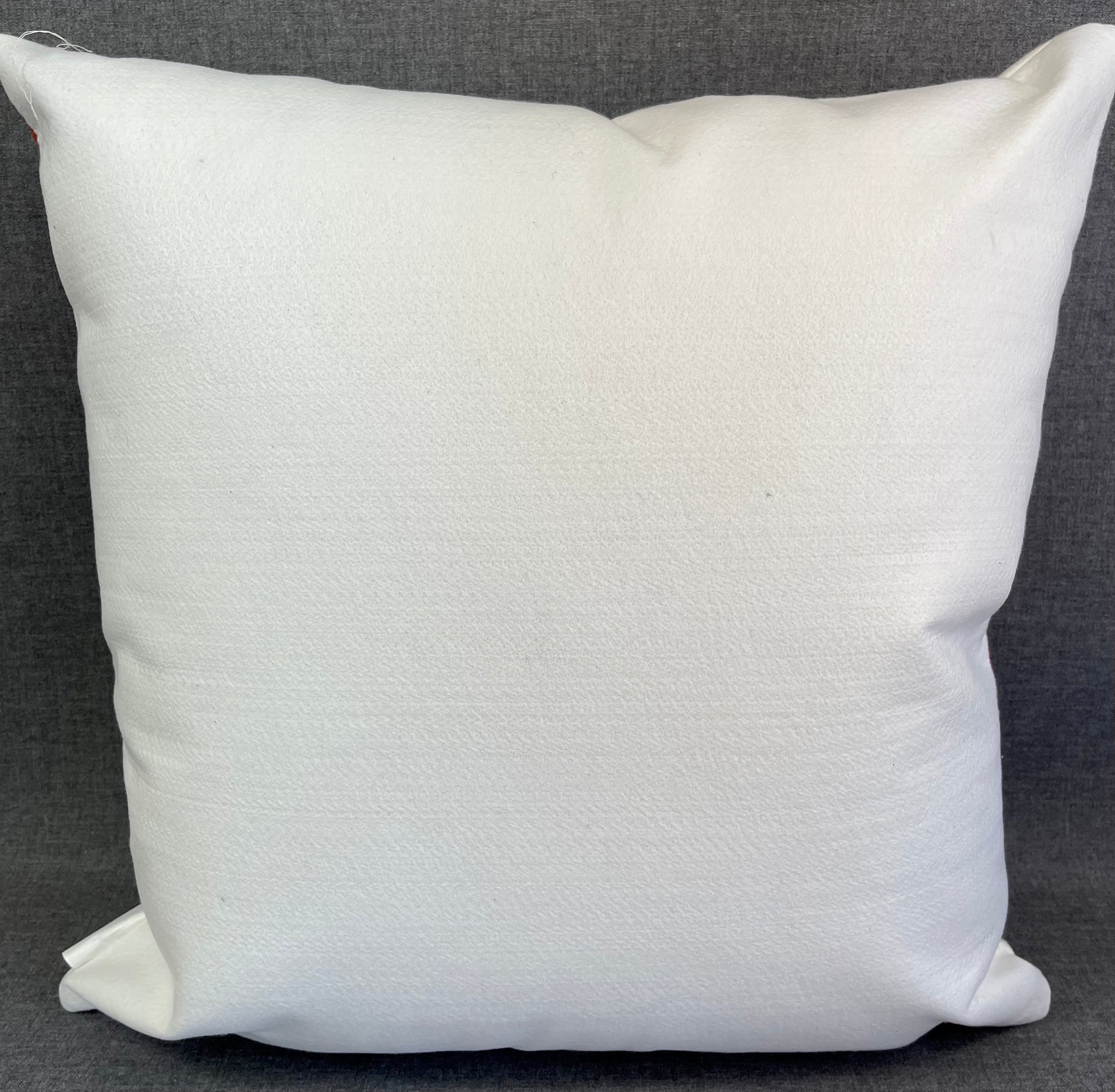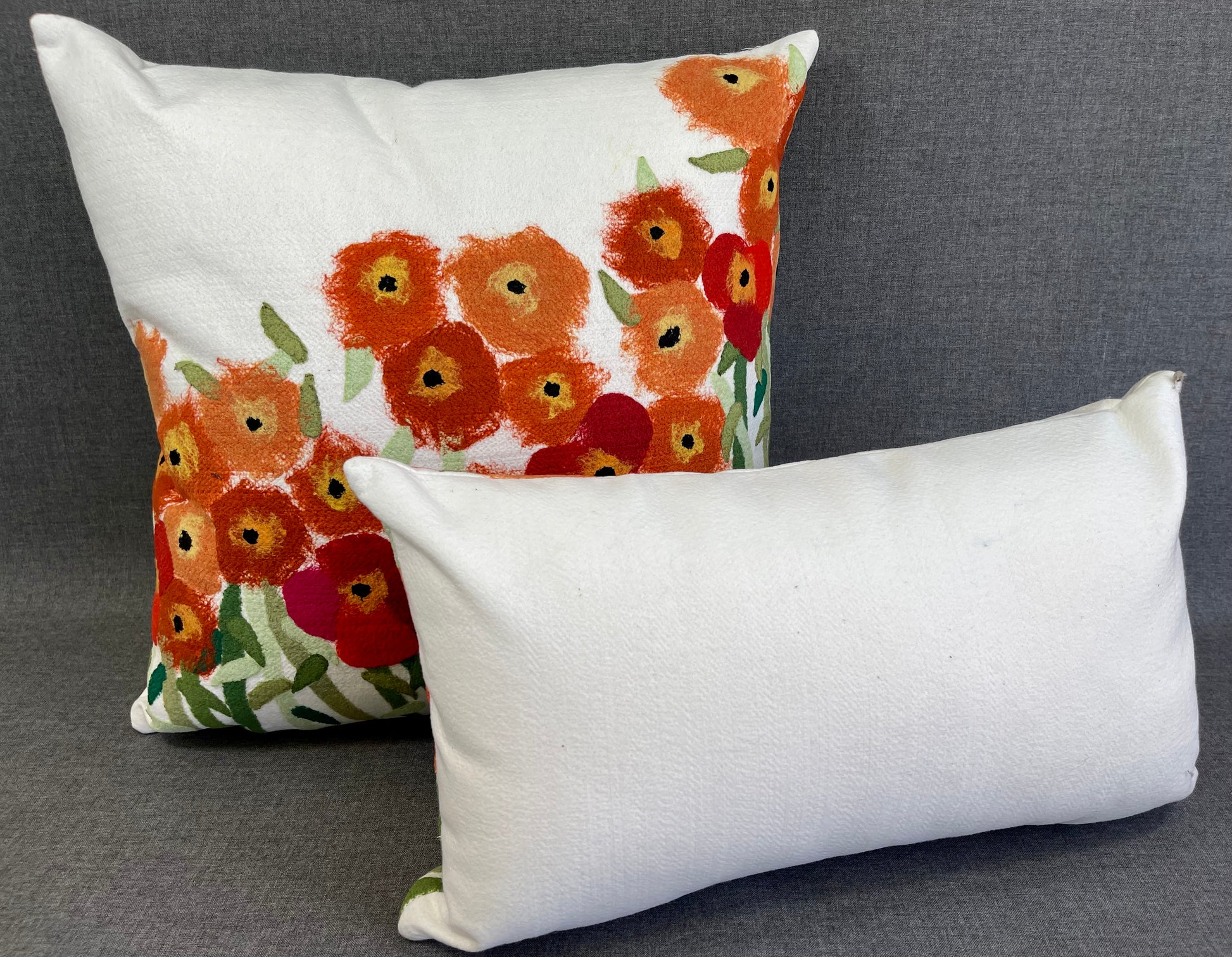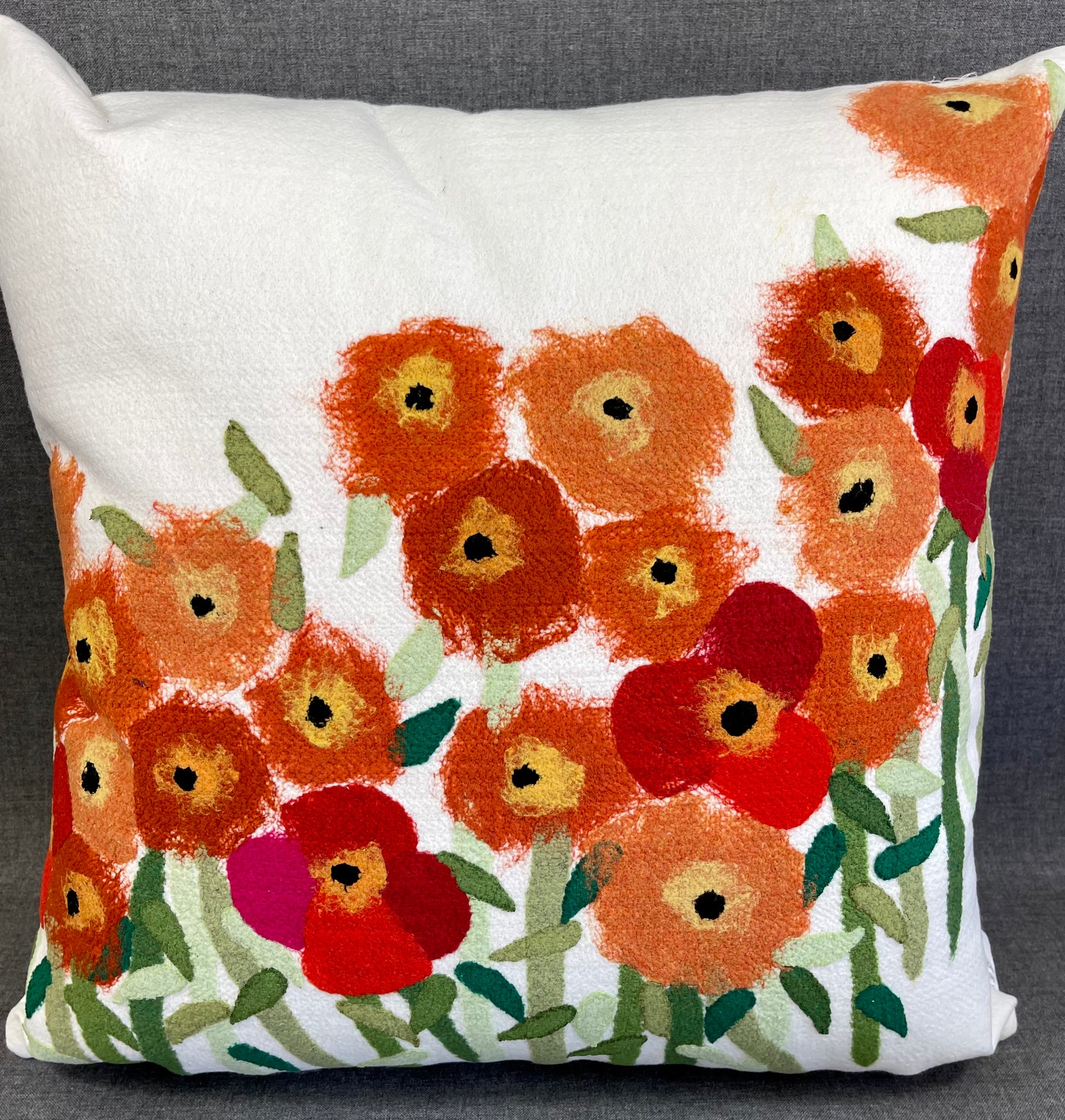 This pillow is 18" x 18" when measured flat with no filling. With filling it is about 5” deep. It contains fiber filling and is made in America. These are limited production runs until the fabric is gone. Cute flowers of red and orange on a white background, surrounded by green leaves.