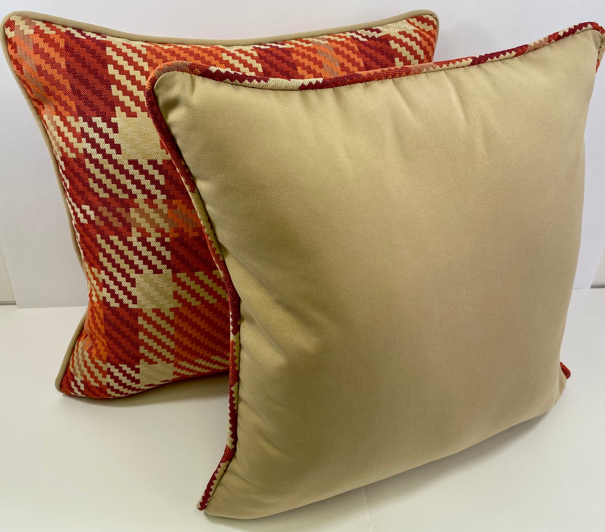 Sunbrella Fabric. This pillow is part of the Rancho Santa Fe collection. This pillow is 22" x 22" when measured flat with no filling. With filling it is about 5” deep. It contains poly filling and is made in America. These are limited production runs until the fabric is gone.