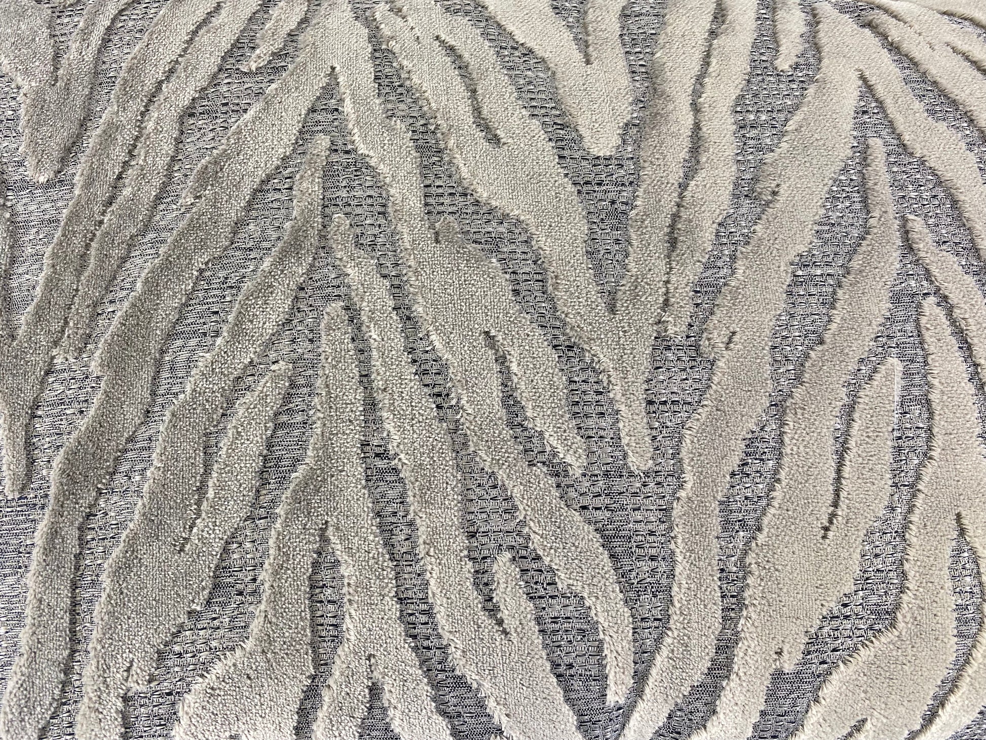 Great pillow to treat a faux solid when you want just a little texture and movement on the back pillows while the front pillows are the stars of the show. This pillow is 24" x 14" when measured flat with no filling. With filling it is about 5" deep. It contains feather and down filling and is made in America.Animal style chevrons in graphite grey on a grey ground.
