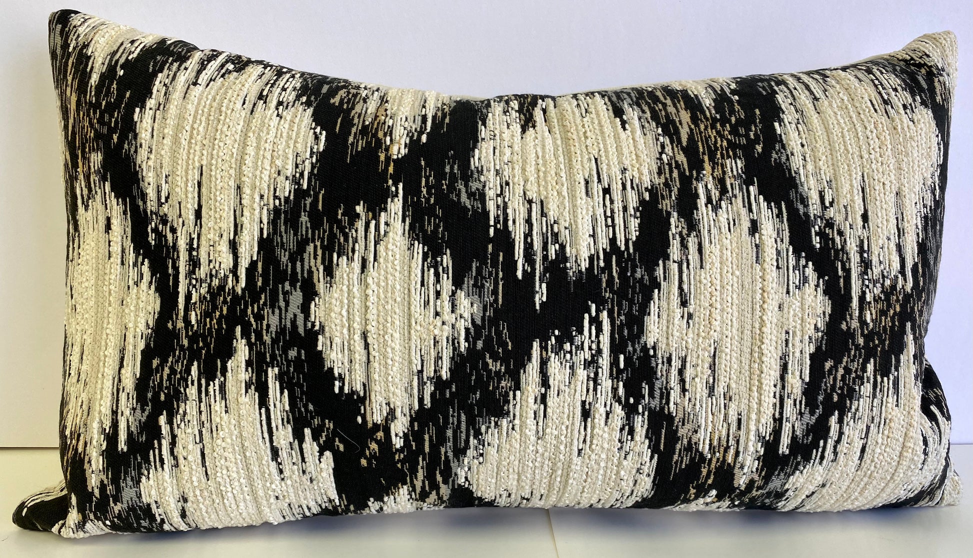 This pillow is 24" x 14" when measured flat with no filling. With filling it is 6" deep. It contains feather and down filling and is made in America. Embroidered Black, Pearl and Ecru Geometric.