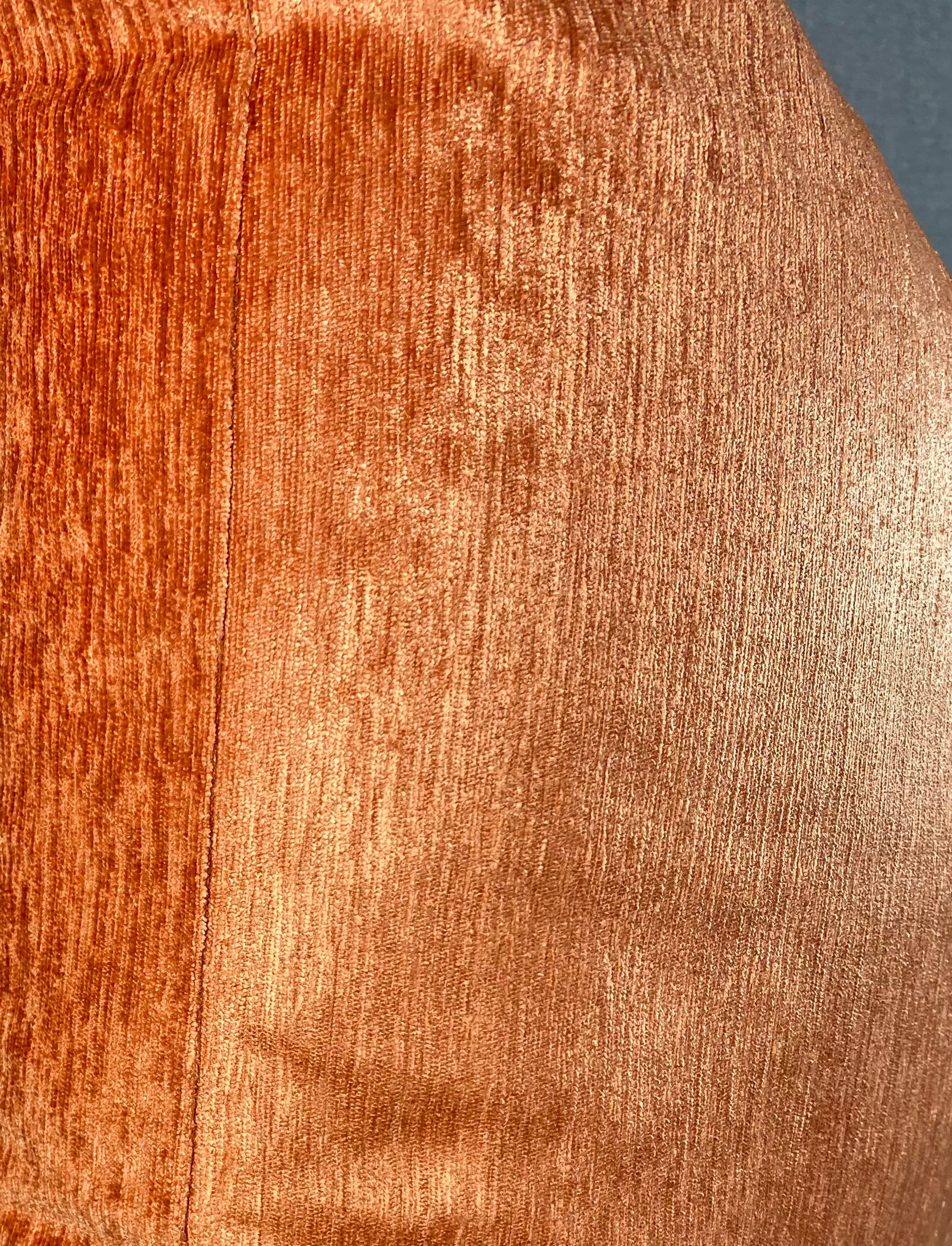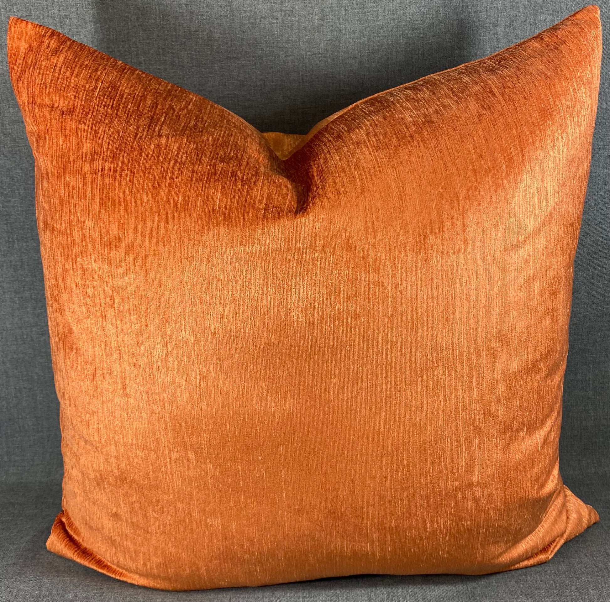 This pillow is 24" x 24" when measured flat with no filling. With filling it is 6" deep. It contains feather and down filling and is made in America. Lovely burnt orange color on a textured fabric.