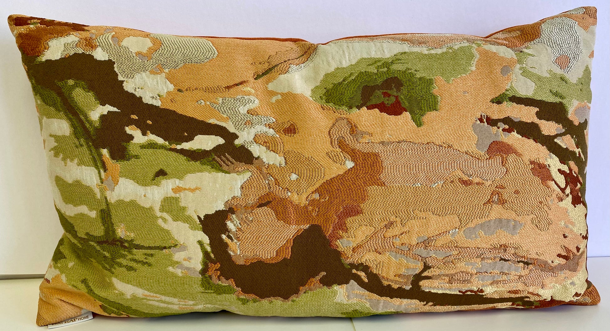 This pillow is 24" x 14" when measured flat with no filling. With filling it is 6" deep. It contains feather and down filling and is made in America. Orange, Coral, Green and Brown in Abstract Pattern