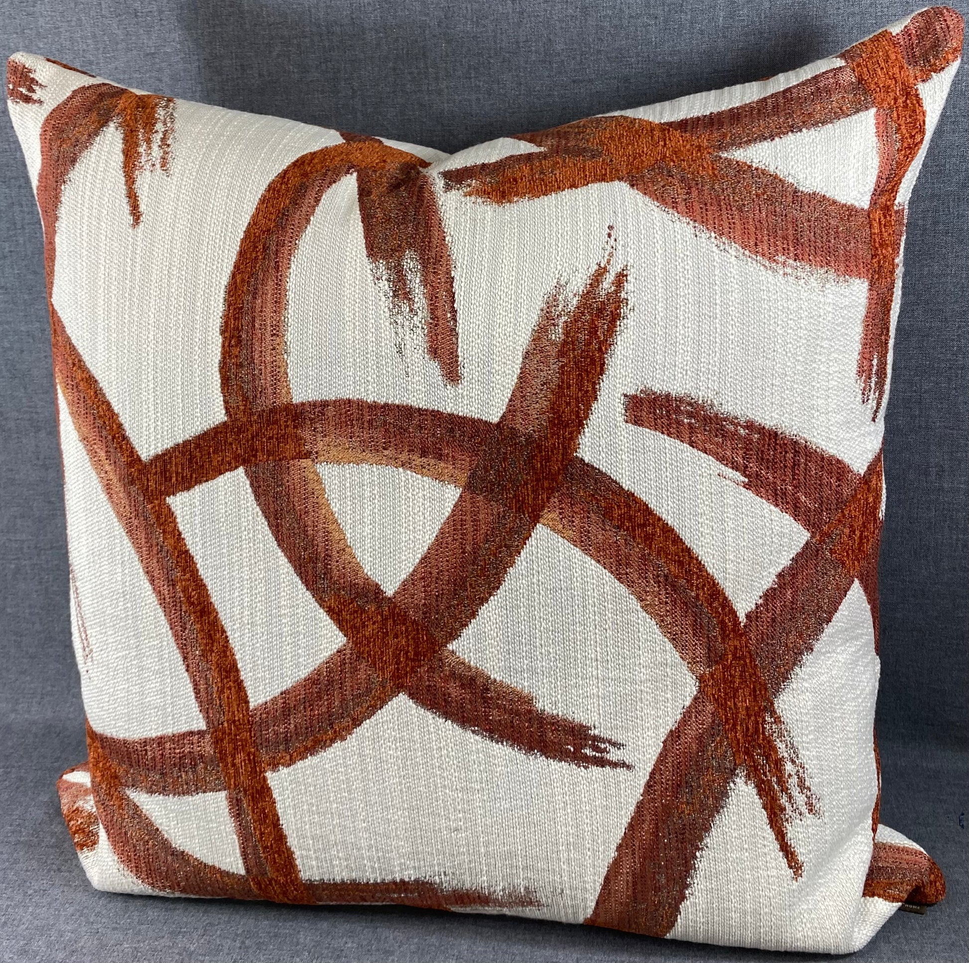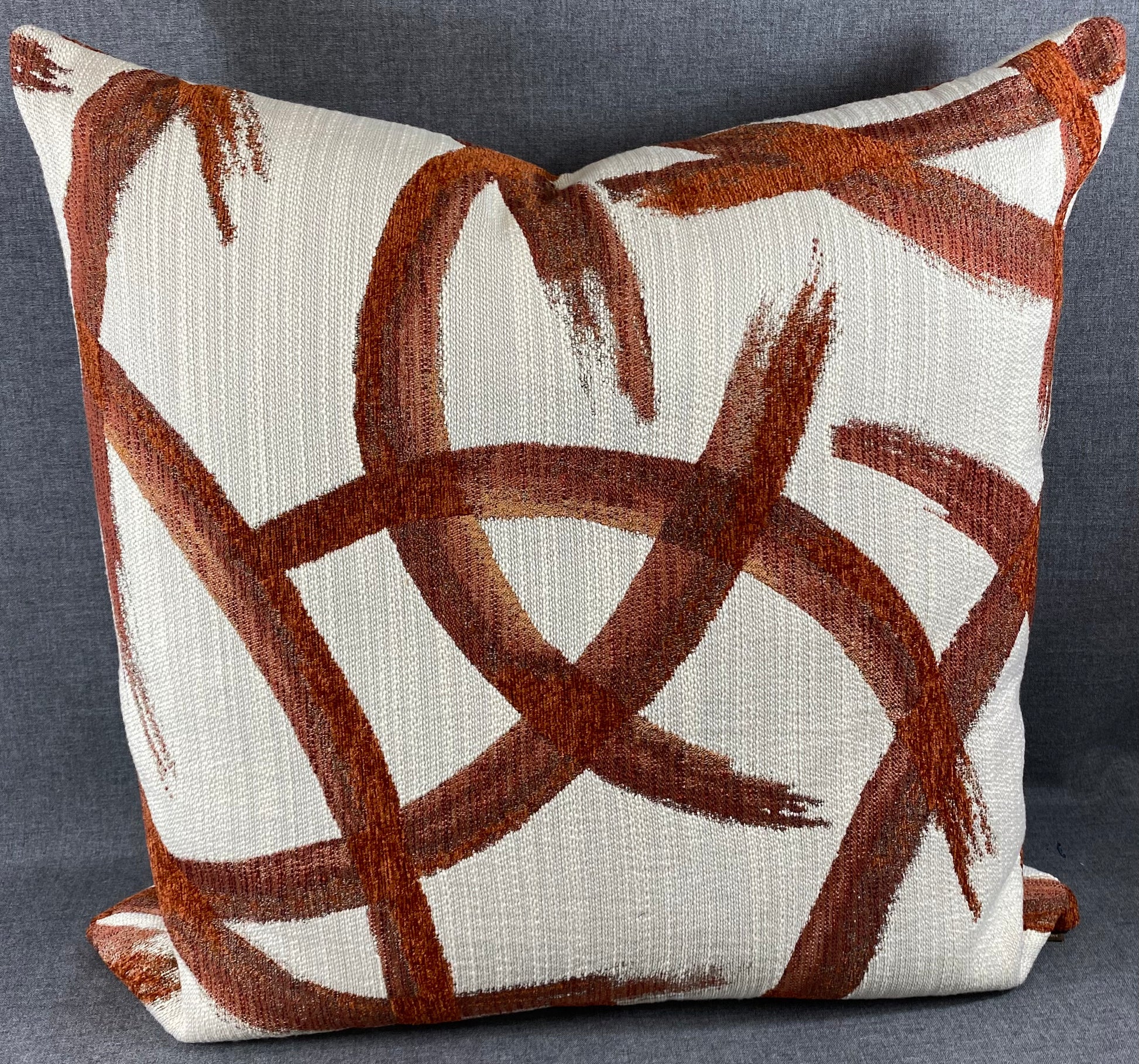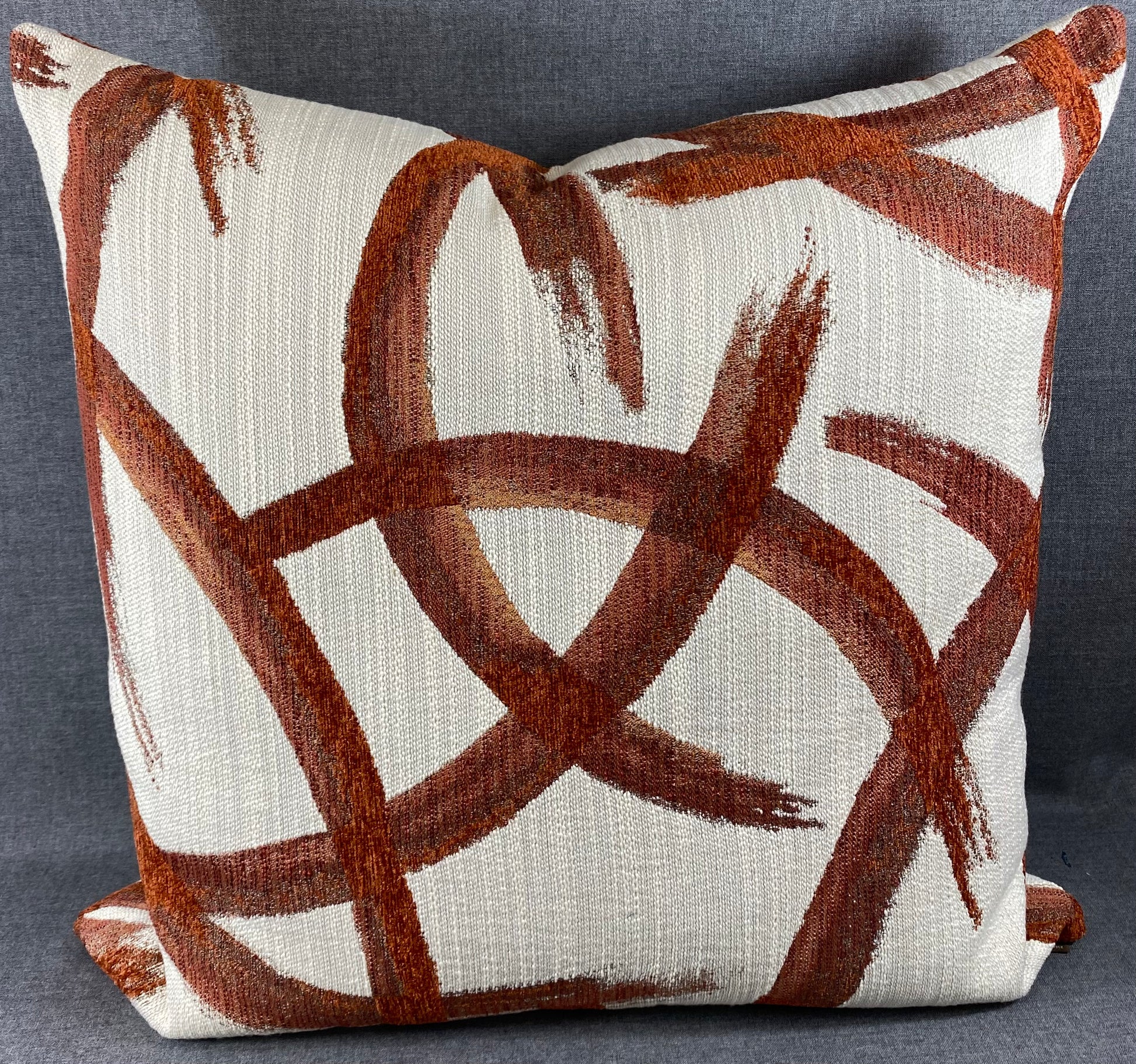 This pillow is 24" x 24" when measured flat with no filling. With filling it is 6" deep. It contains feather and down filling and is made in America. Copper paint brush strokes invoke a feel of Shuji, the ancient art of Japanese calligraphy.