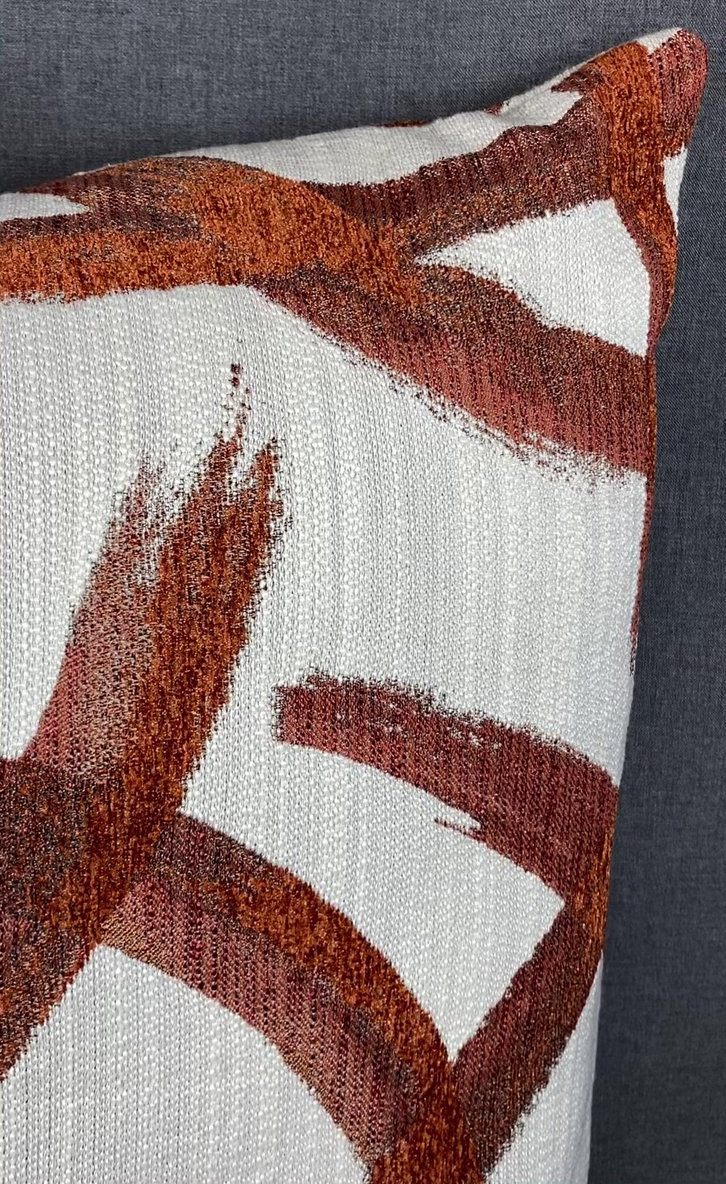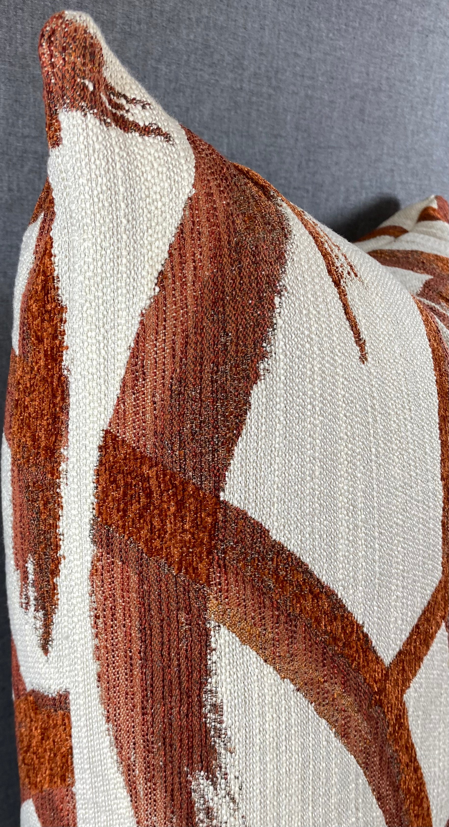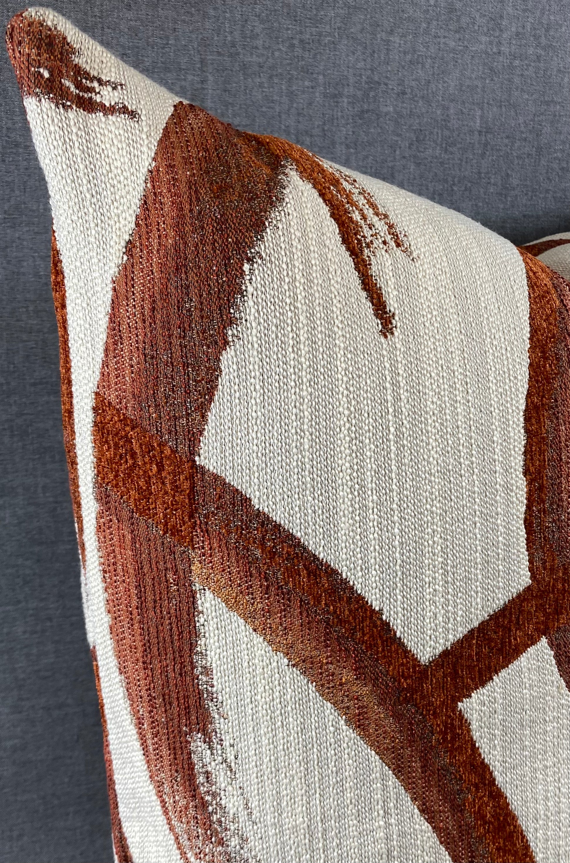 This pillow is 24" x 24" when measured flat with no filling. With filling it is 6" deep. It contains feather and down filling and is made in America. Copper paint brush strokes invoke a feel of Shuji, the ancient art of Japanese calligraphy.