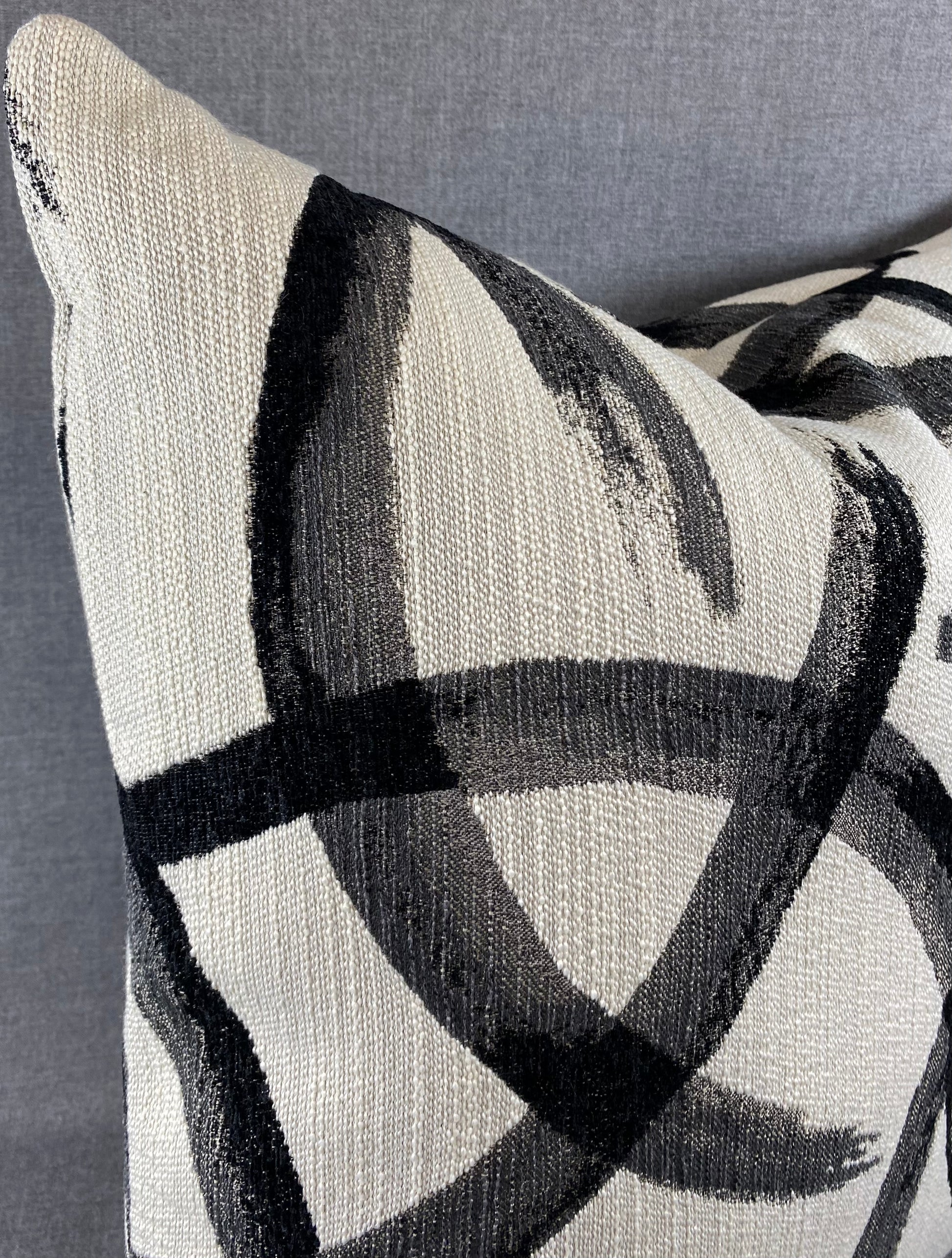 This pillow is 24" x 24" when measured flat with no filling. With filling it is 6" deep. It contains feather and down filling and is made in America. Broad black paint brush strokes invoke a feel of Shuji, the ancient art of Japanese calligraphy.