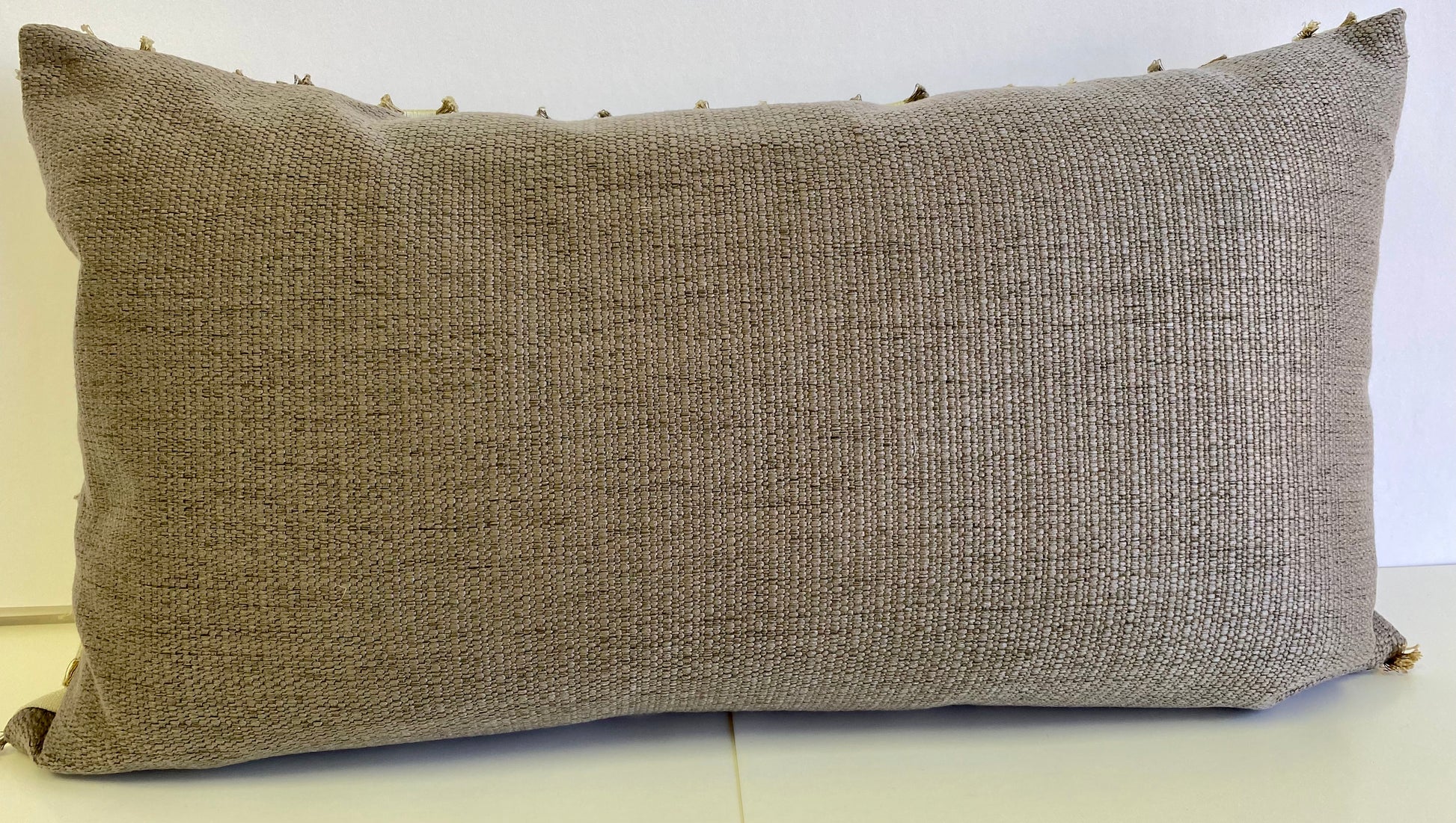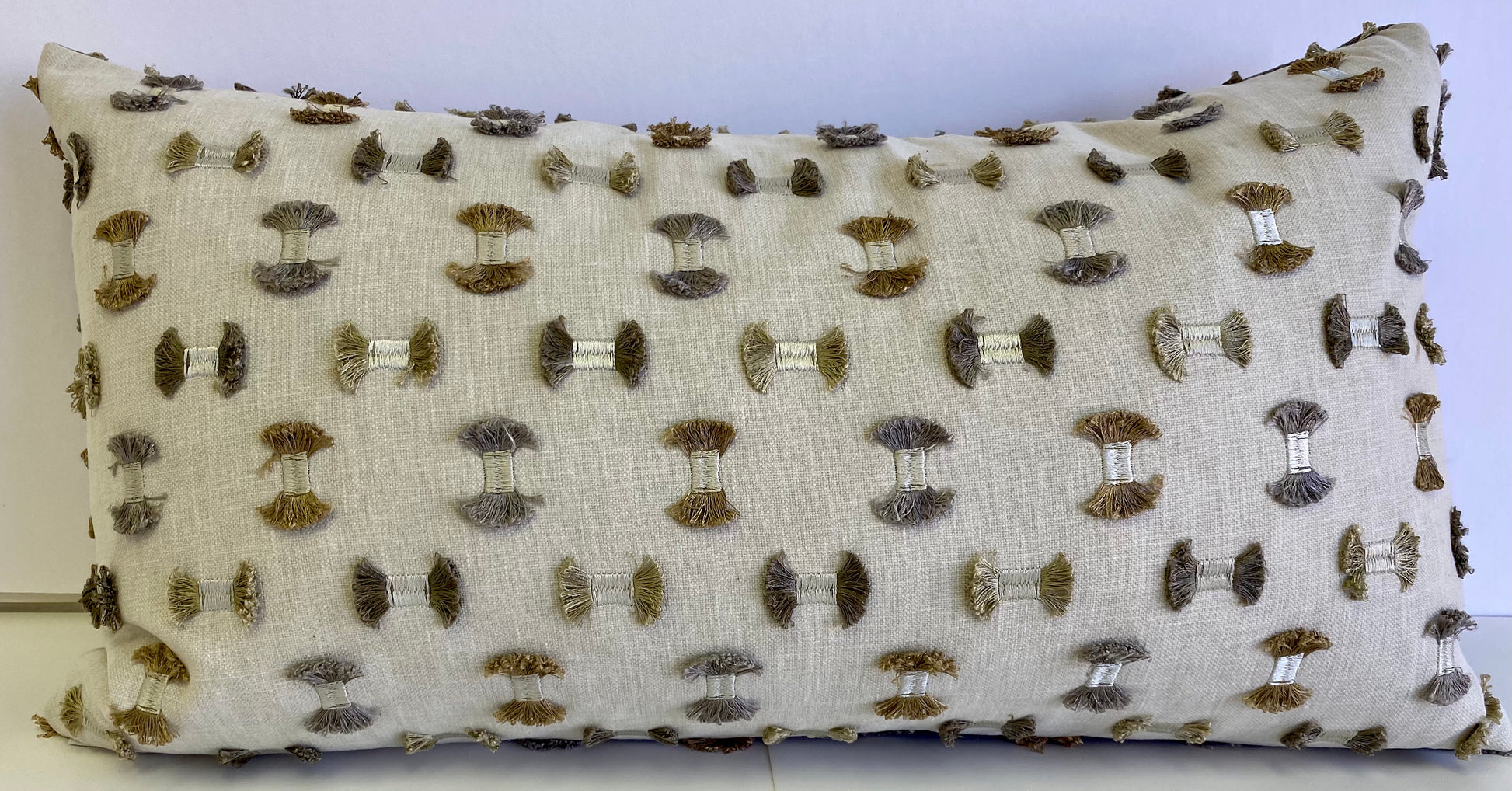 Luxury Lumbar Pillow - 24" x 14" - Frayed Travertine; Fringed bows of taupe, grays, silver & white on a cream linen background