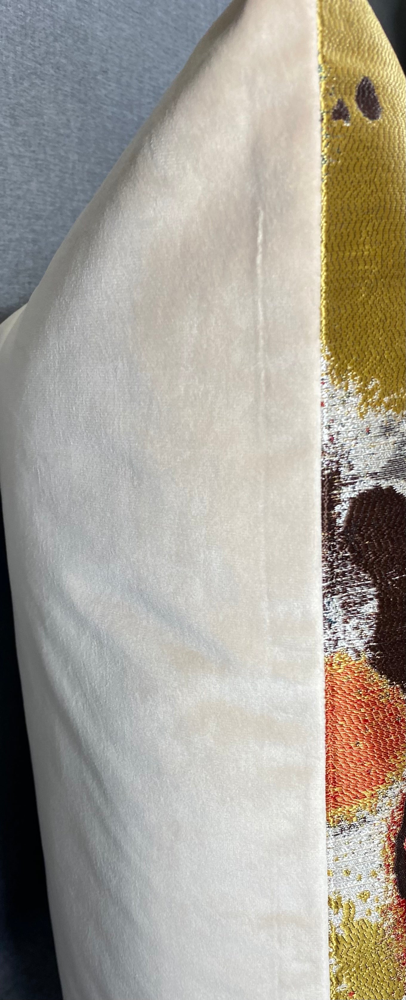 This pillow is 24" x 24" when measured flat with no filling. With filling it is 6" deep. It contains feather and down filling and is made in America. It has a taupe back. Bright red, green, teal, bronze and yellow spots on a cream background and with a cream back.