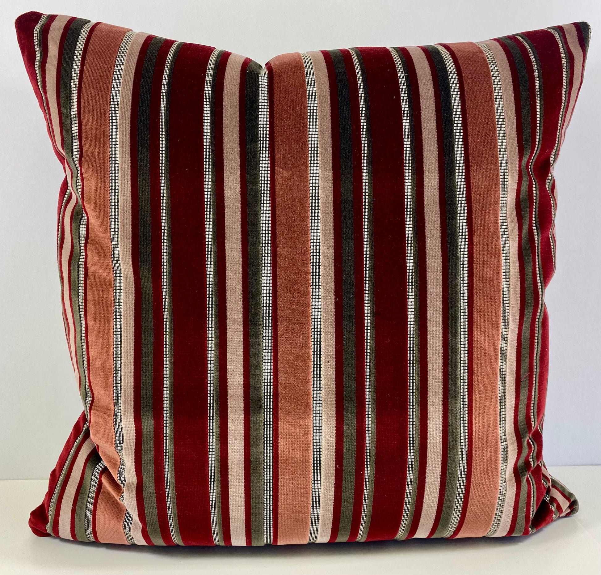 This pillow is part of the Madison Club Collection. It pairs nicely with Madison Club - Dusky Rose and for a co-ordinted look try adding Madison Club - Ribbon Rose. 24" x 24" when measured flat with no filling. With filling it is 6" deep. It contains feather and down filling and is made in America. Plush velvet stripes