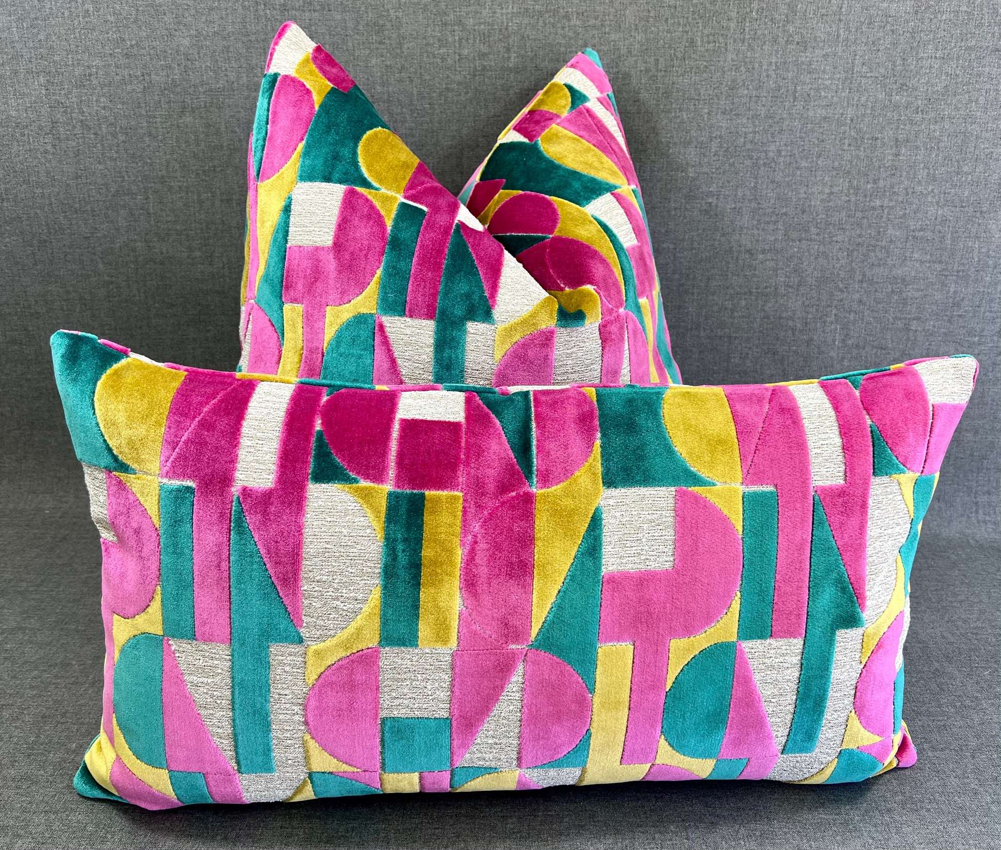 This pillow is 24" x 24" when measured flat with no filling. With filling it is 6" deep. It contains feather and down filling and is made in America. Bright Turquoise, Fuchsia, Yellow and Cream in a geometric cut velvet pattern