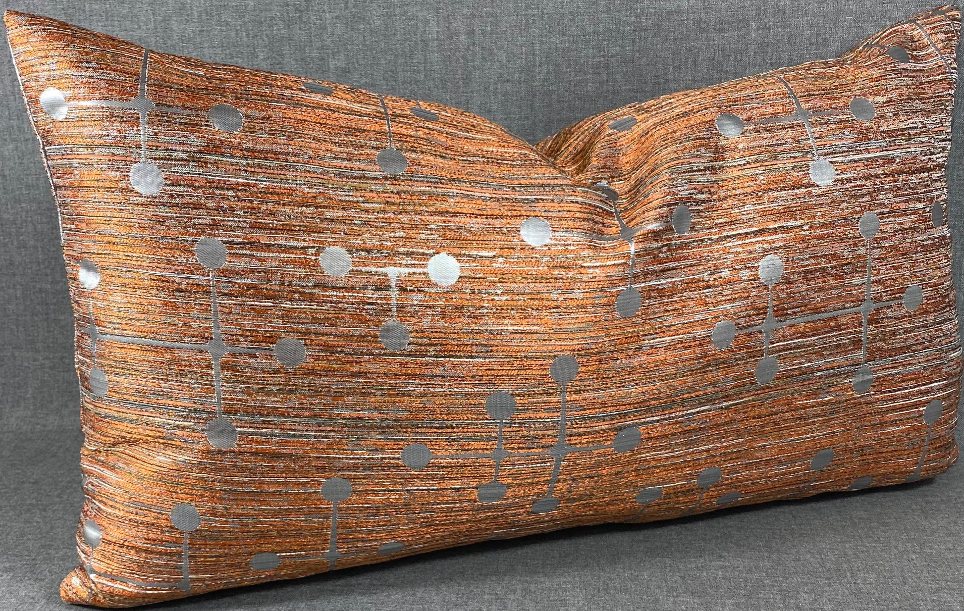 This pillow is 24" x 14" when measured flat with no filling. With filling it is 6" deep. It contains feather and down filling and is made in America. Silver mid-century modern design over a copper background.