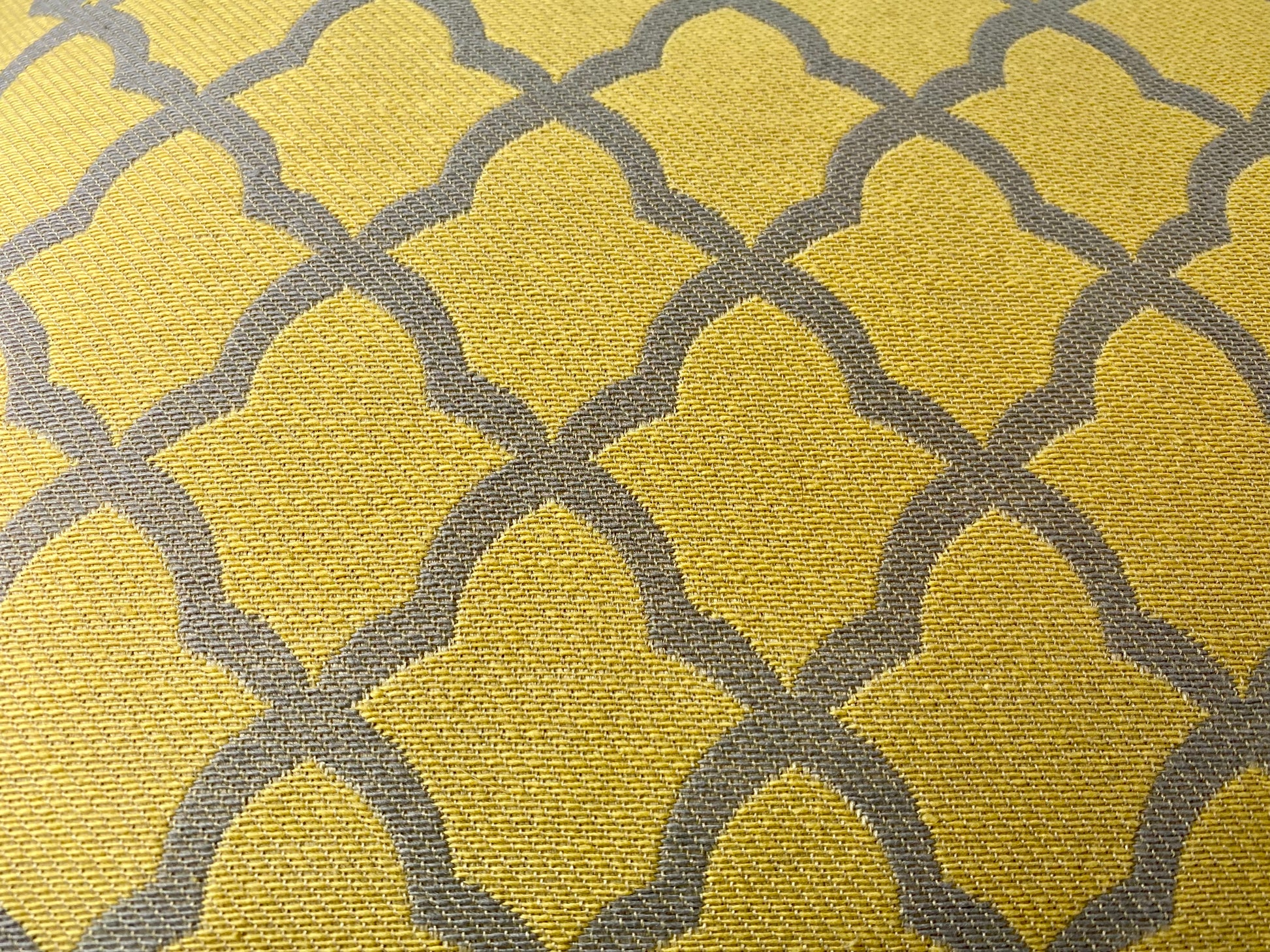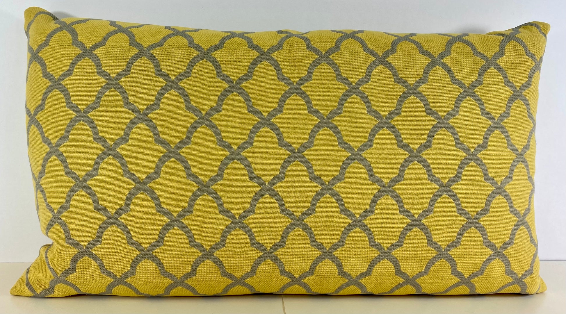 This pillow is 24" x 14" when measured flat with no filling. With filling it is 6" deep. It contains feather and down filling and is made in America. Geometric tile pattern woven in butter yellow with grey "grout" lines.