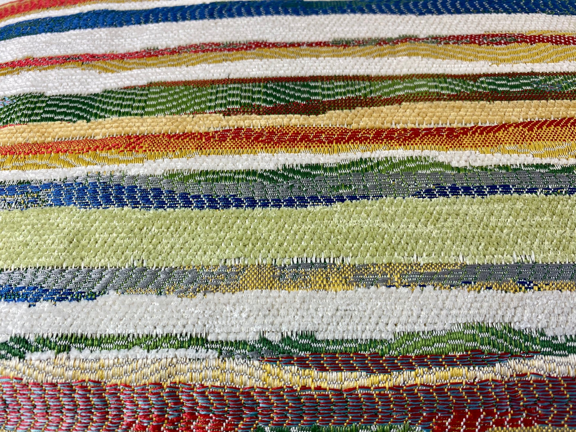 This pillow is 24" x 14" when measured flat with no filling. With filling it is 6" deep. It contains feather and down filling and is made in America. Chenille fabric in green, red, orange & cream striped pattern.