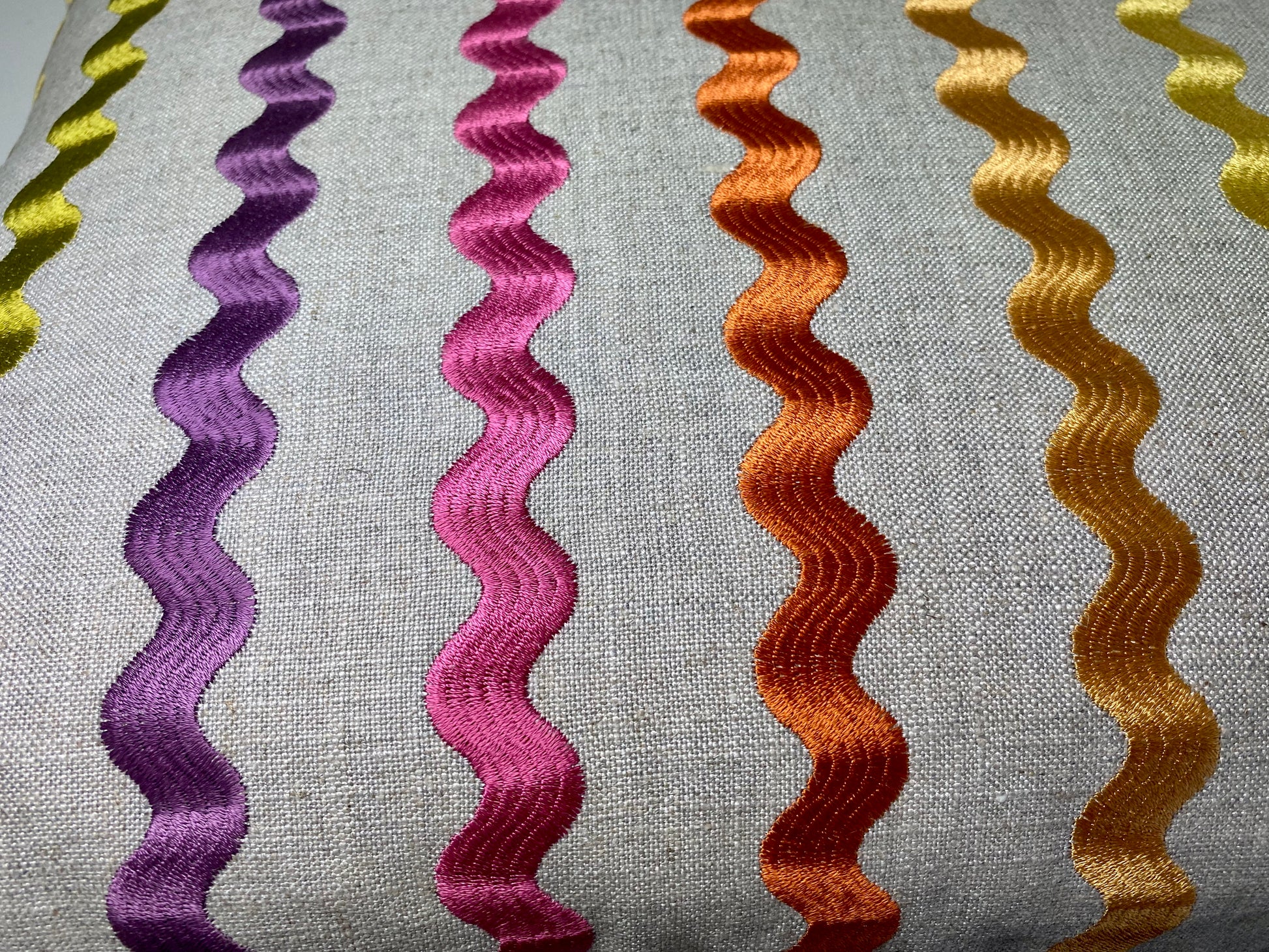This pillow is 24" x 14" when measured flat with no filling. With filling it is 6" deep. It contains feather and down filling and is made in America. These are limited production runs until the fabric is gone. Embroidered wavy stripes of green, yellow, orange, fuchsia and purple on a cream background