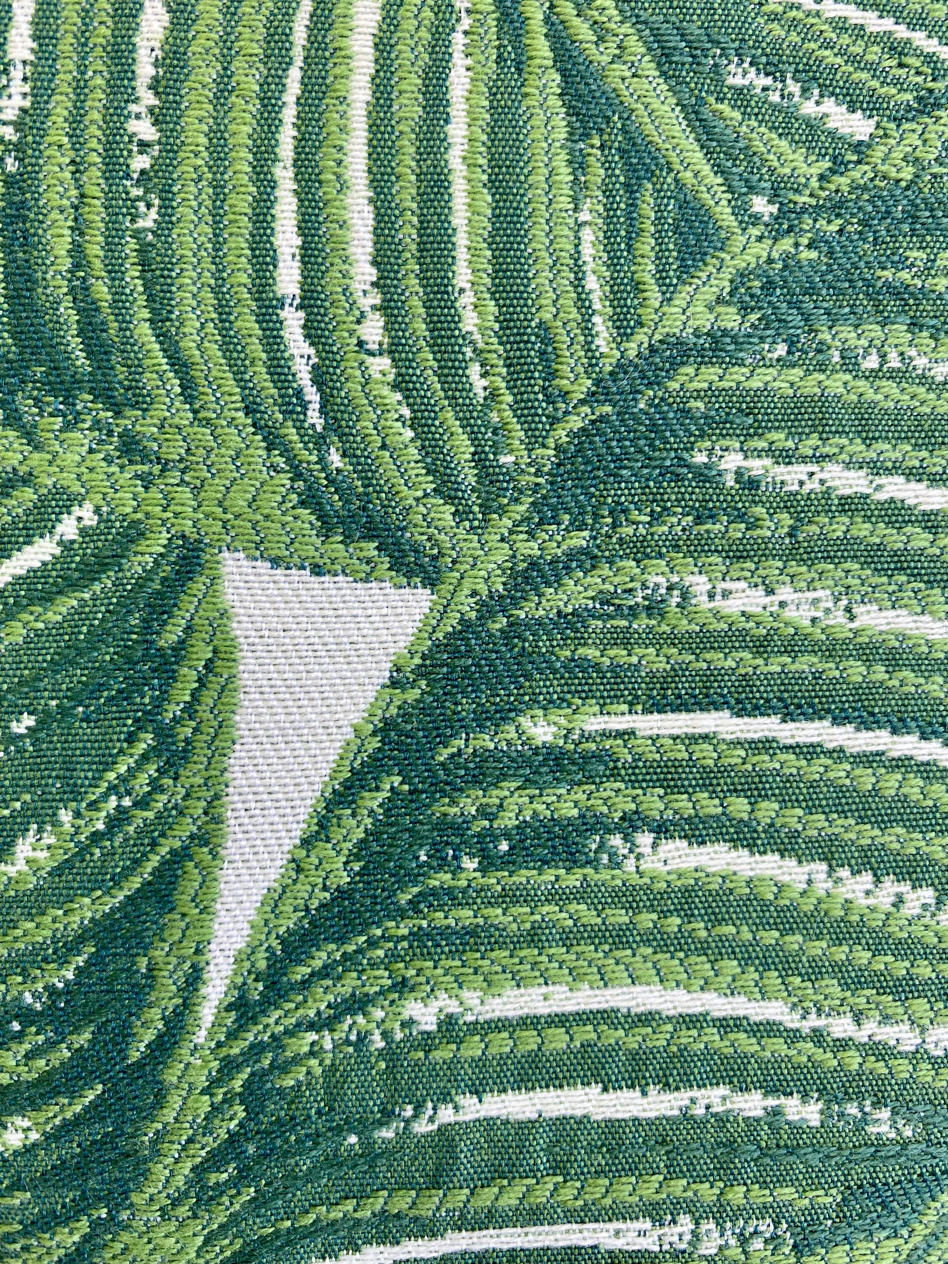 Limited edition. This pillow is 24" x 24" when measured flat with no filling. With filling it is 6" deep. It contains feather and down filling and is made in America. These are limited production runs until the fabric is gone. Lush green embroidered foliage on a white base.