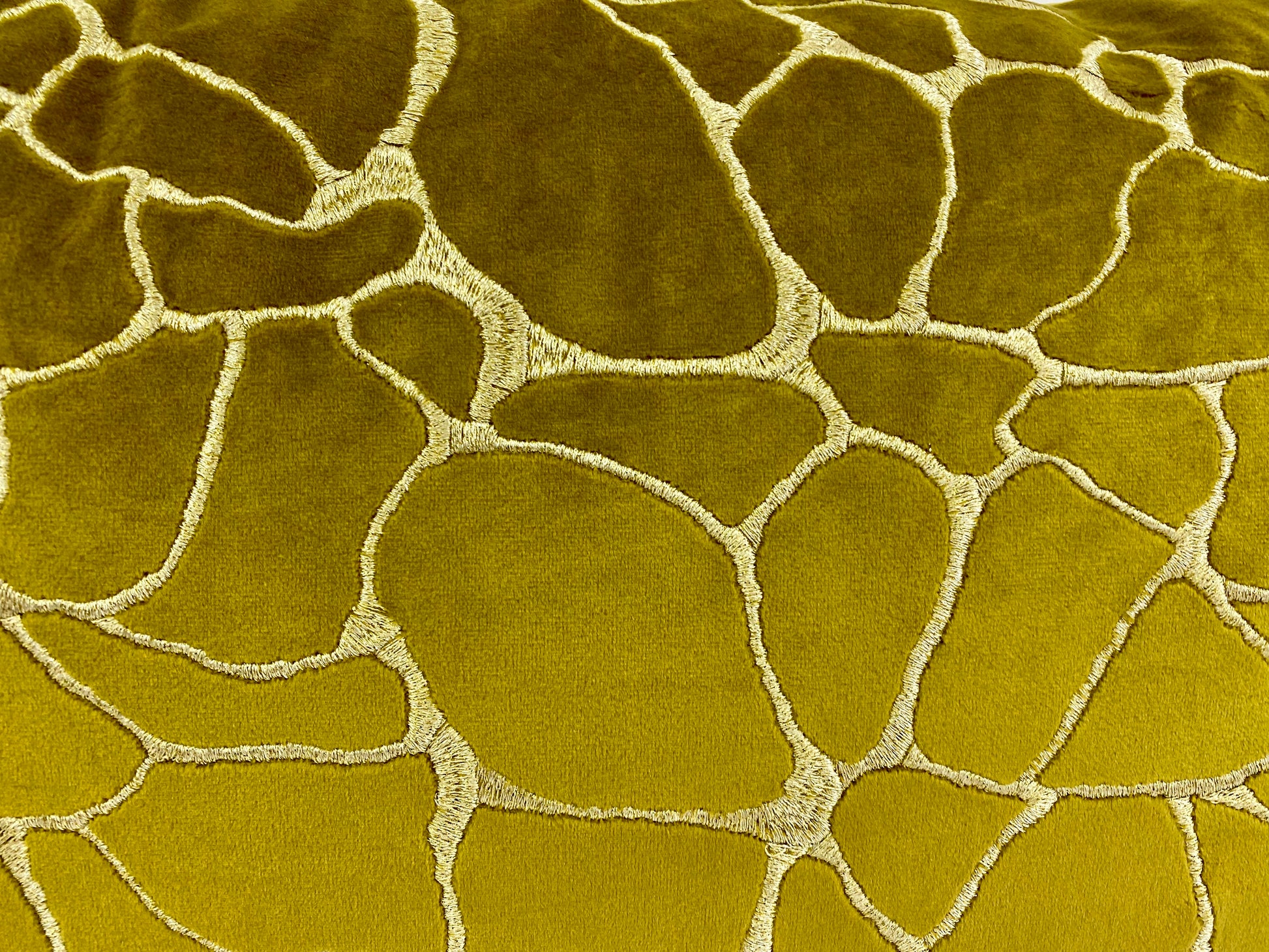 This pillow is 24" x 14" when measured flat with no filling. With filling it is 6" deep. It contains feather and down filling and is made in America. Silver embroidery creates pebbles like shape on a sulfur green velvet.