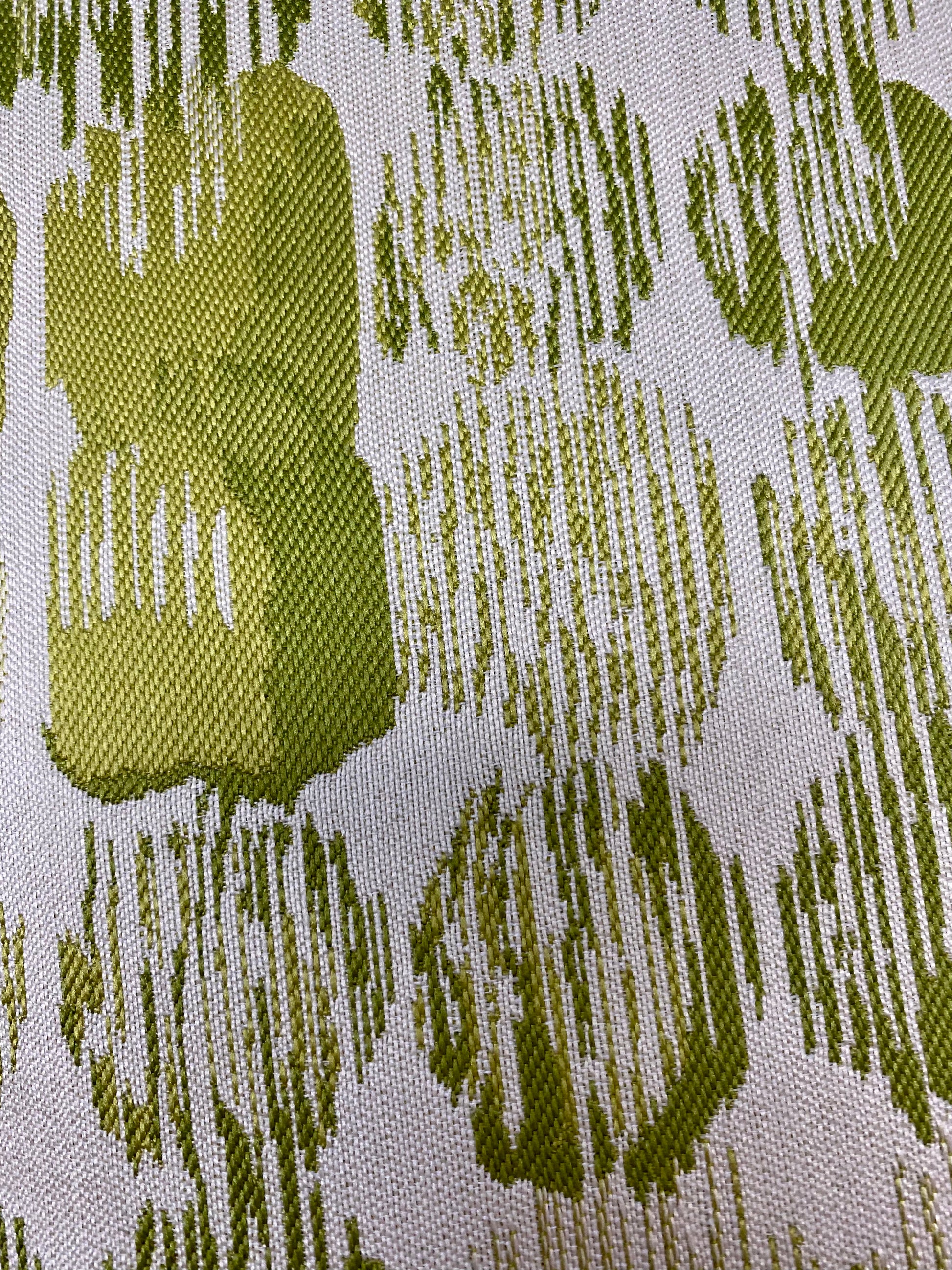 Limited edition. This pillow is 24" x 14" when measured flat with no filling. With filling it is 6" deep. It contains feather and down filling and is made in America. Bright lime green abstract pattern on a cream background