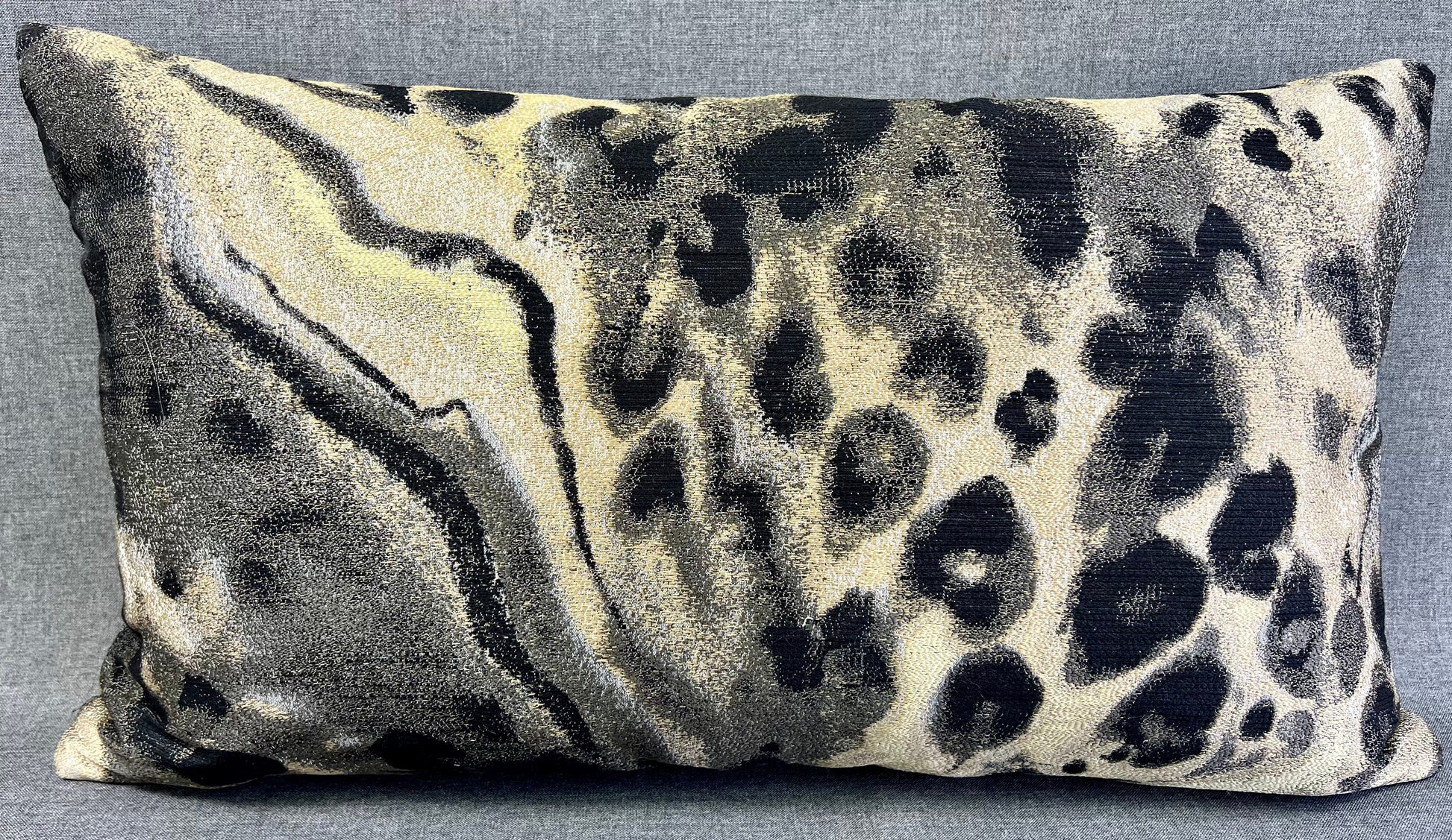 This pillow is 24" x 14" when measured flat with no filling. With filling it is 6" deep. It contains feather and down filling and is made in America. Golds & Black in an abstract animal print design