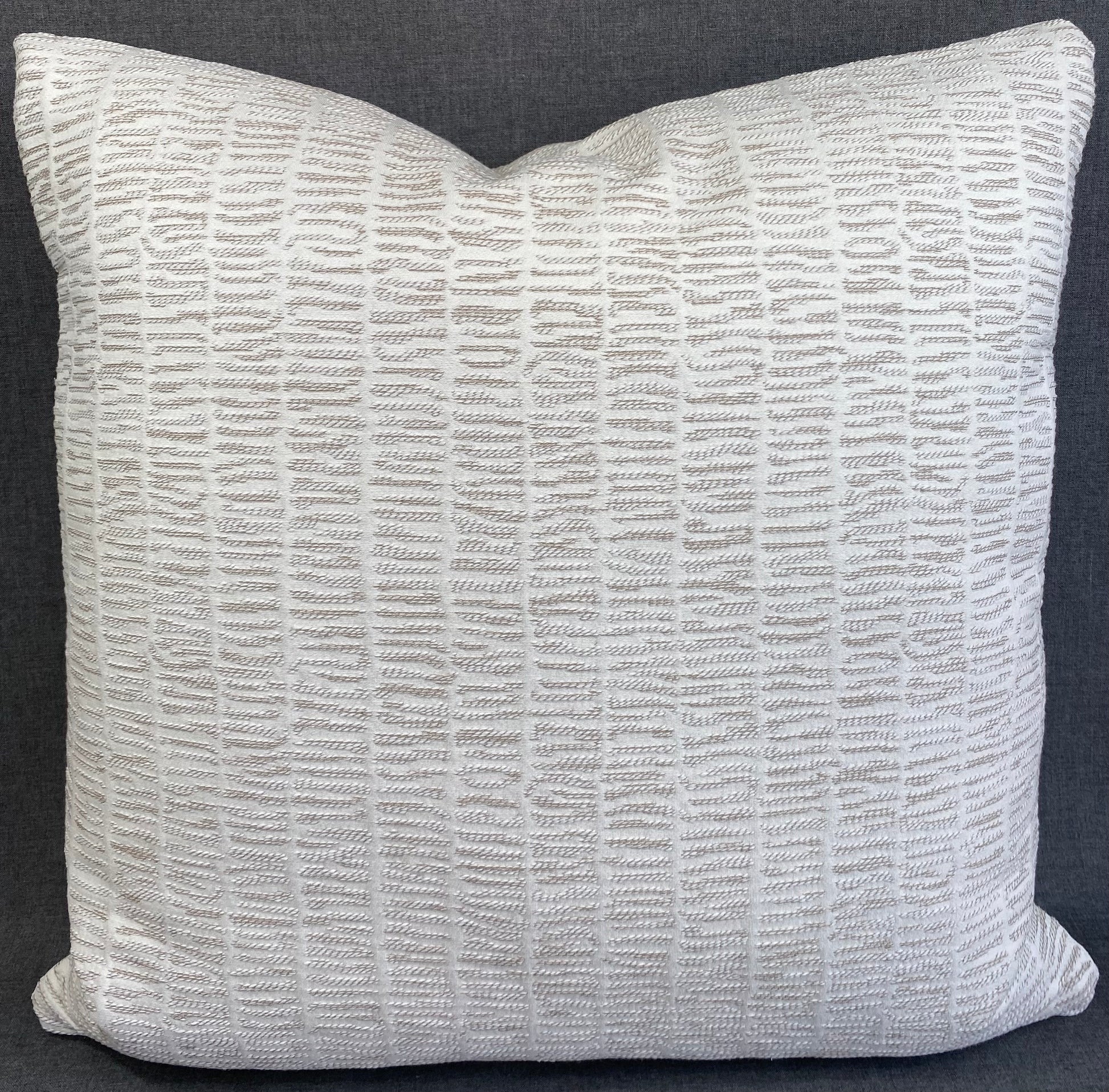 This pillow is 24" x 24" when measured flat with no filling. With filling it is 6" deep. It contains feather and down filling and is made in America.