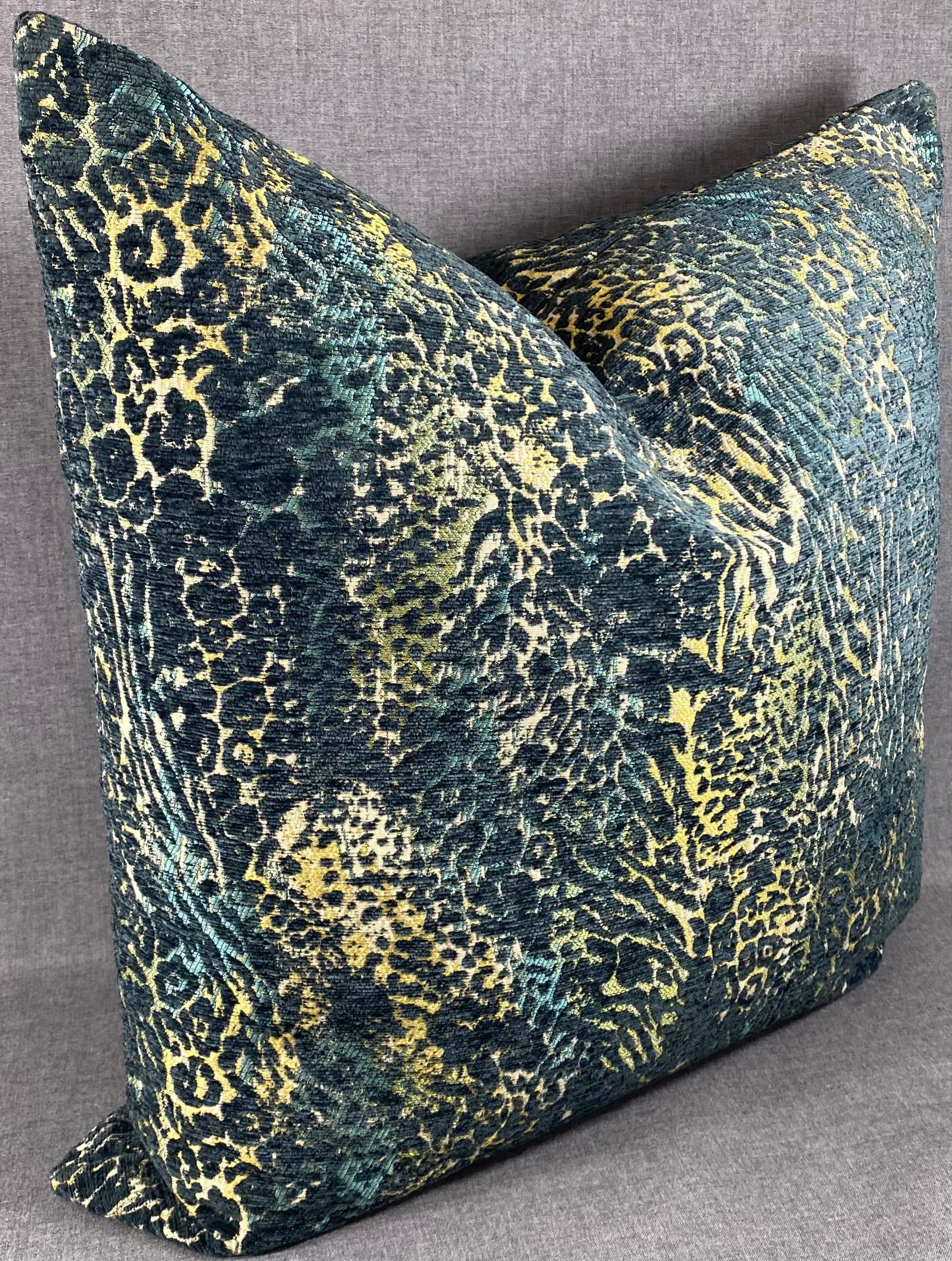 This pillow is 24" x 24" when measured flat with no filling. With filling it is 6" deep. It contains feather and down filling and is made in America. Abstract animal print of greens and yellow.