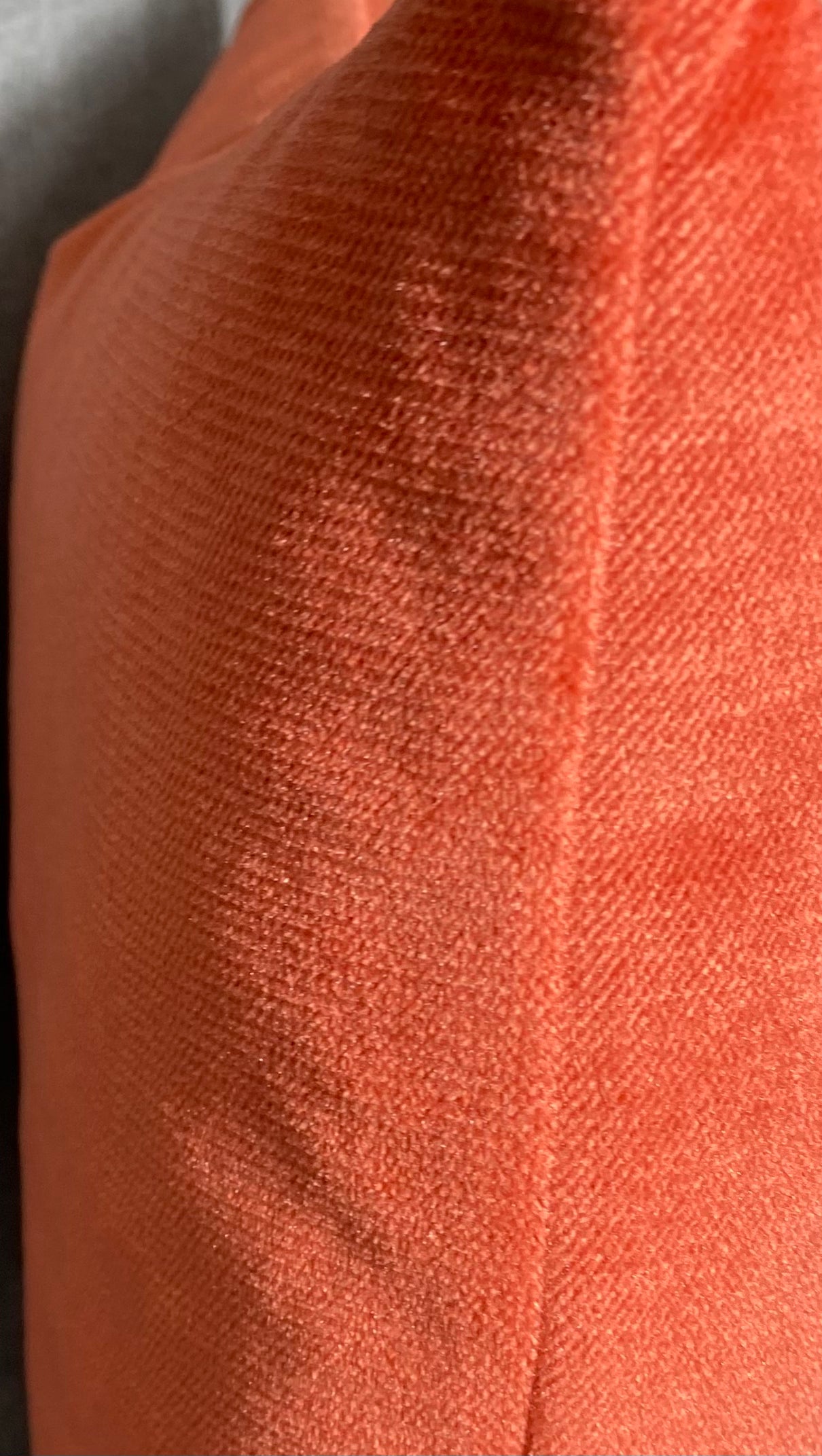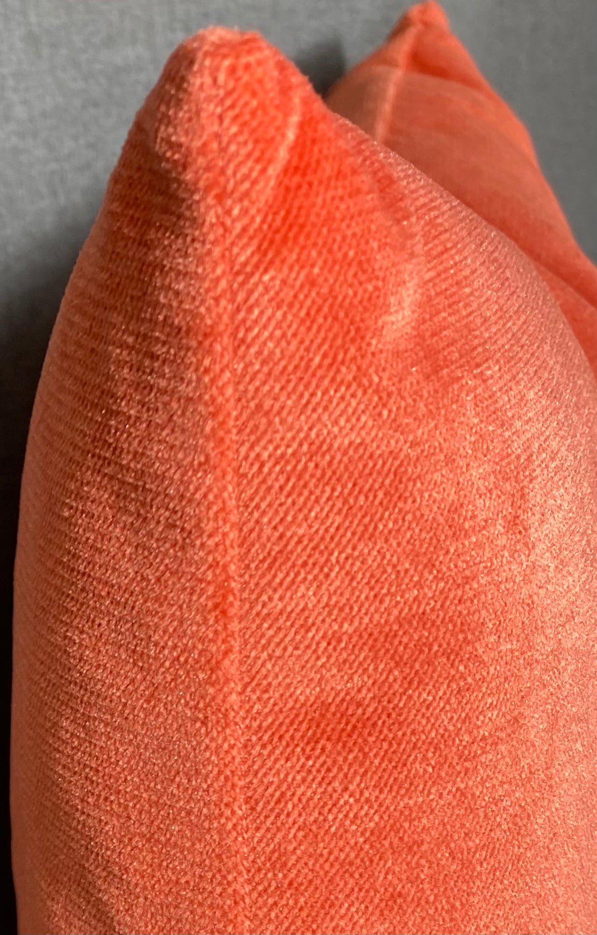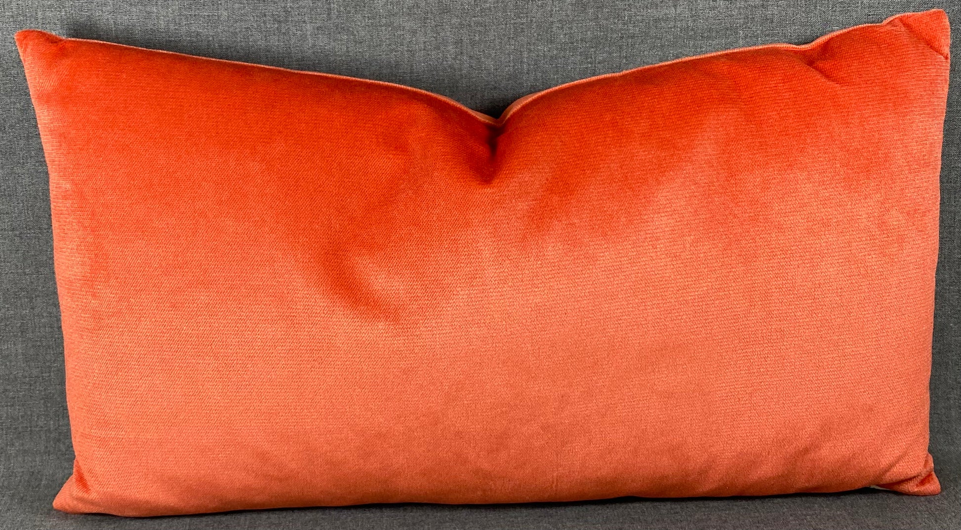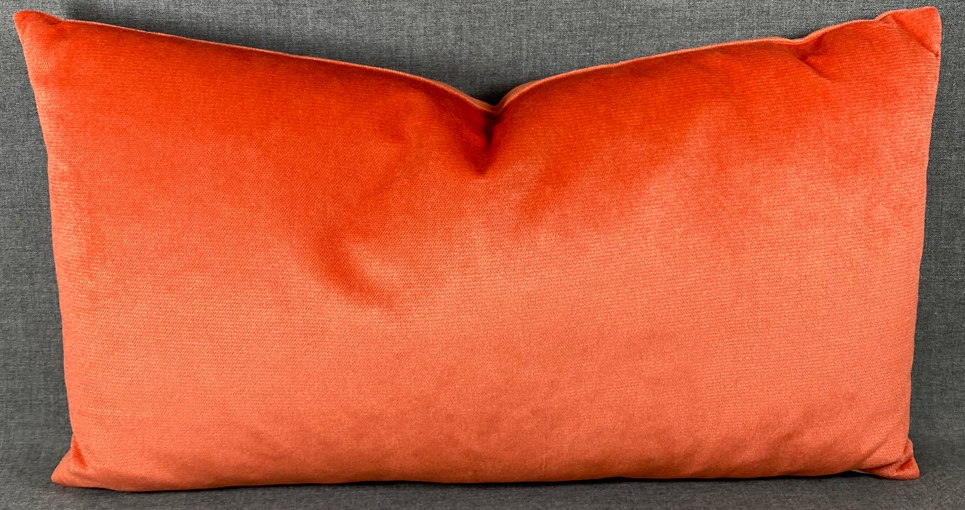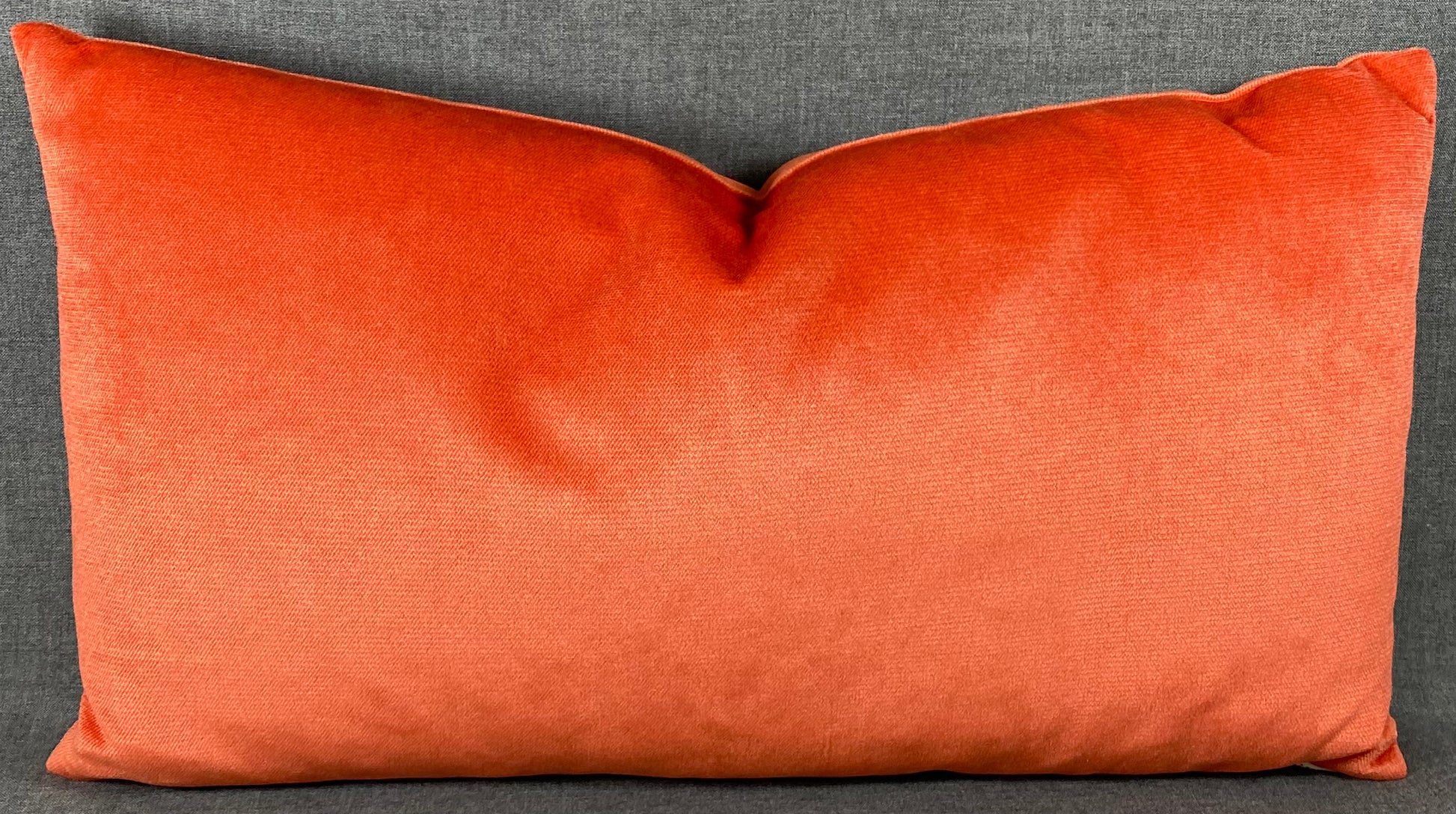 This pillow is 24" x 14" when measured flat with no filling. With filling it is 6" deep. It contains feather and down filling and is made in America. Bright orange solid in a creamy smooth velvet fabric.