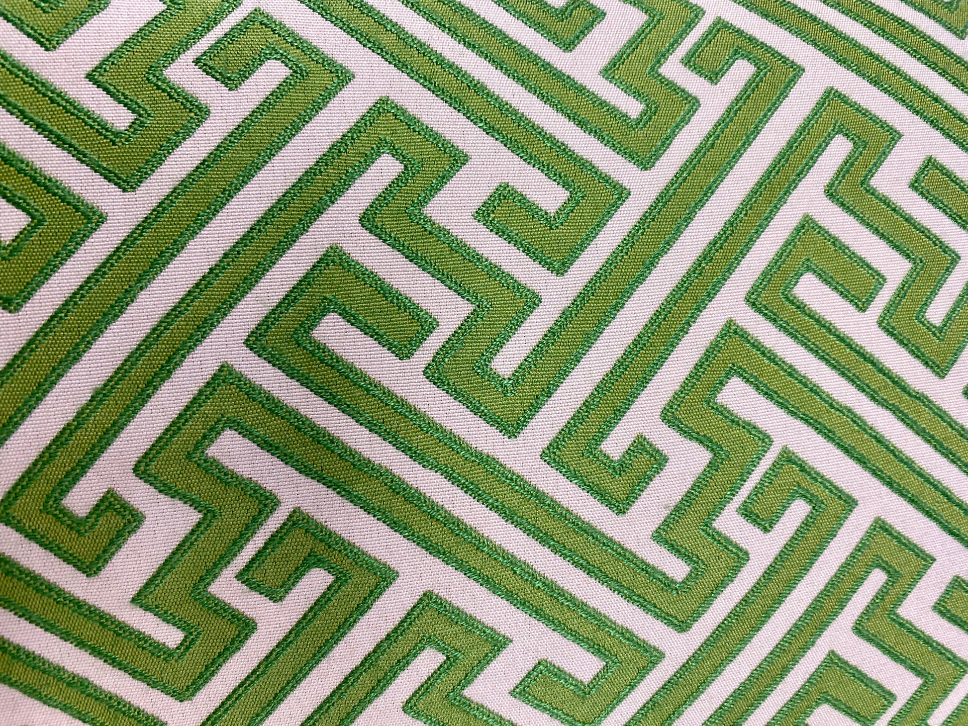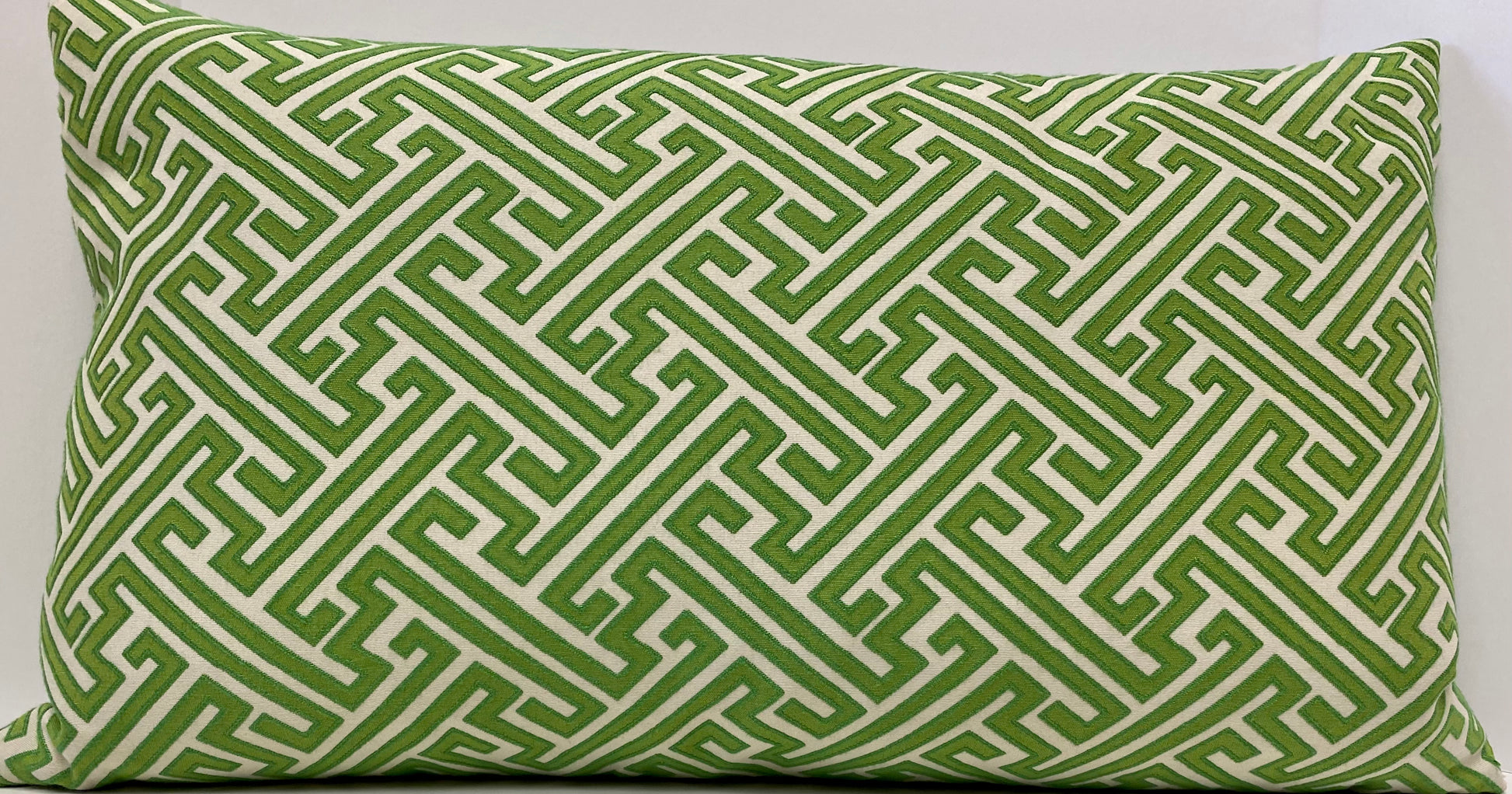 This pillow is 24" x 14" when measured flat with no filling. With filling it is 6" deep. It contains feather and down filling and is made in America. Lime green embroidered maze geometric pattern over a cream background.