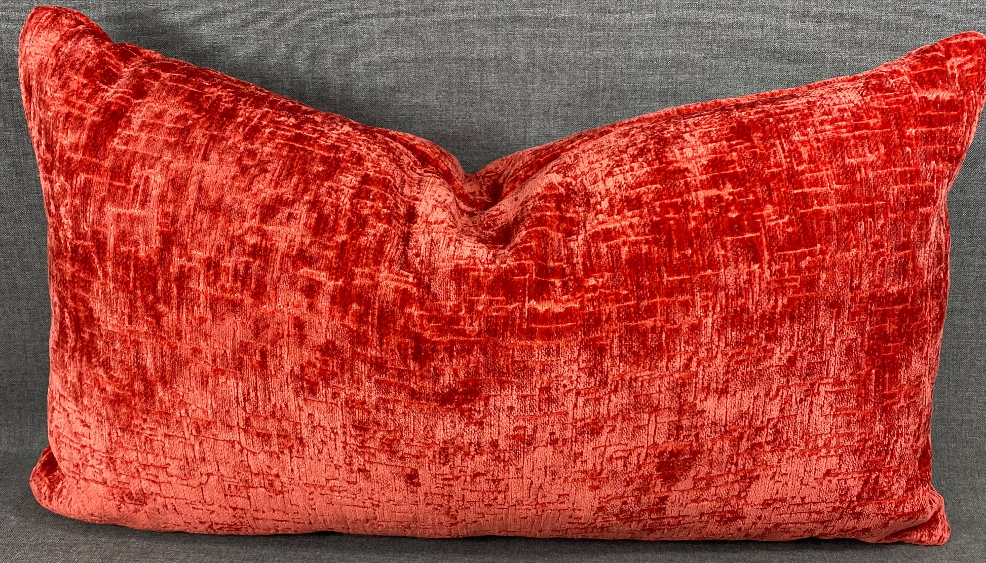 The handle of this fabric is lush. The color really is a true red orange as you see it here. This pillow is 24" x 14" when measured flat with no filling. With filling it is 6" deep. It contains feather and down filling and is made in America. Red orange textured chenille.