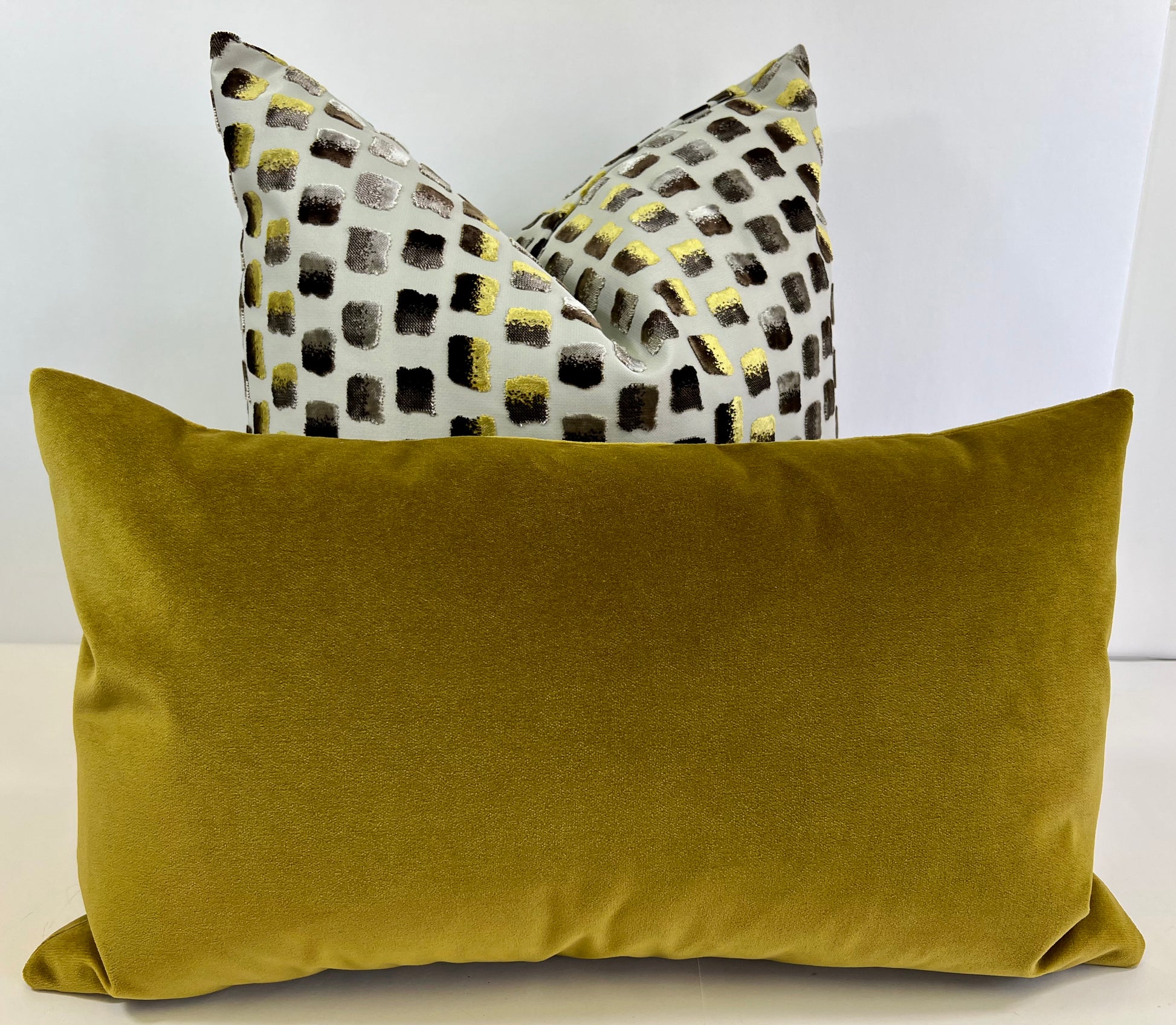 Limited edition. This is the sort of velvet you want to run your fingers through. The nap is think and soft. the color is lush and deep. This pillow is 24" x 14" when measured flat with no filling. With filing it is 6" deep. It contains feather and down filling, and is made in America. A beautiful shade of deep chartreuse