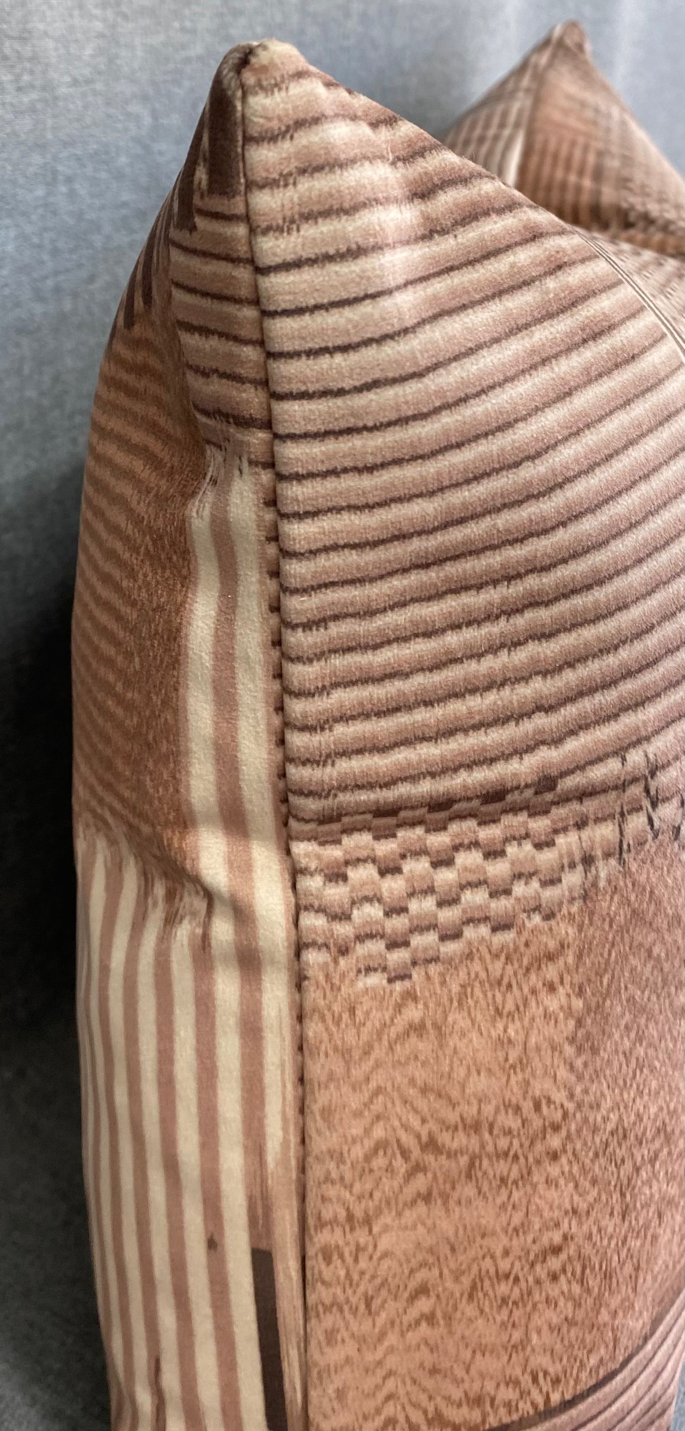 An earthy / tribal vibe that works well with other patterns, black, rust and deep mushroom colors. This pillow is 24" x 14" when measured flat with no filling. With filling it is 6" deep. It contains feather and down filling and is made in America. Chenille stripes of taupe, brown, black & gold on a cream background