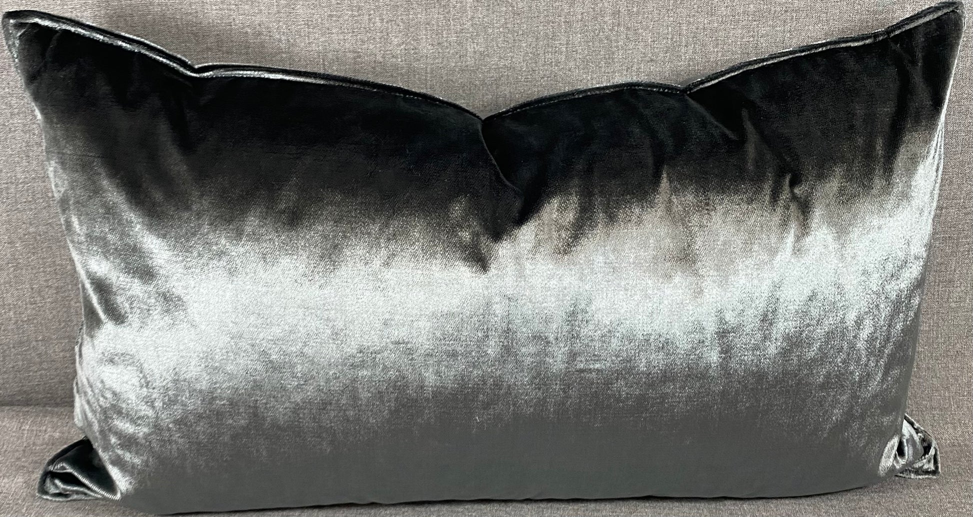 This pillow is 24" x 14" when measured flat with no filling. With filling it is 6" deep. It contains feather and down filling and is made in America. These are limited production runs until the fabric is gone. Lush graphite shiny velvet.