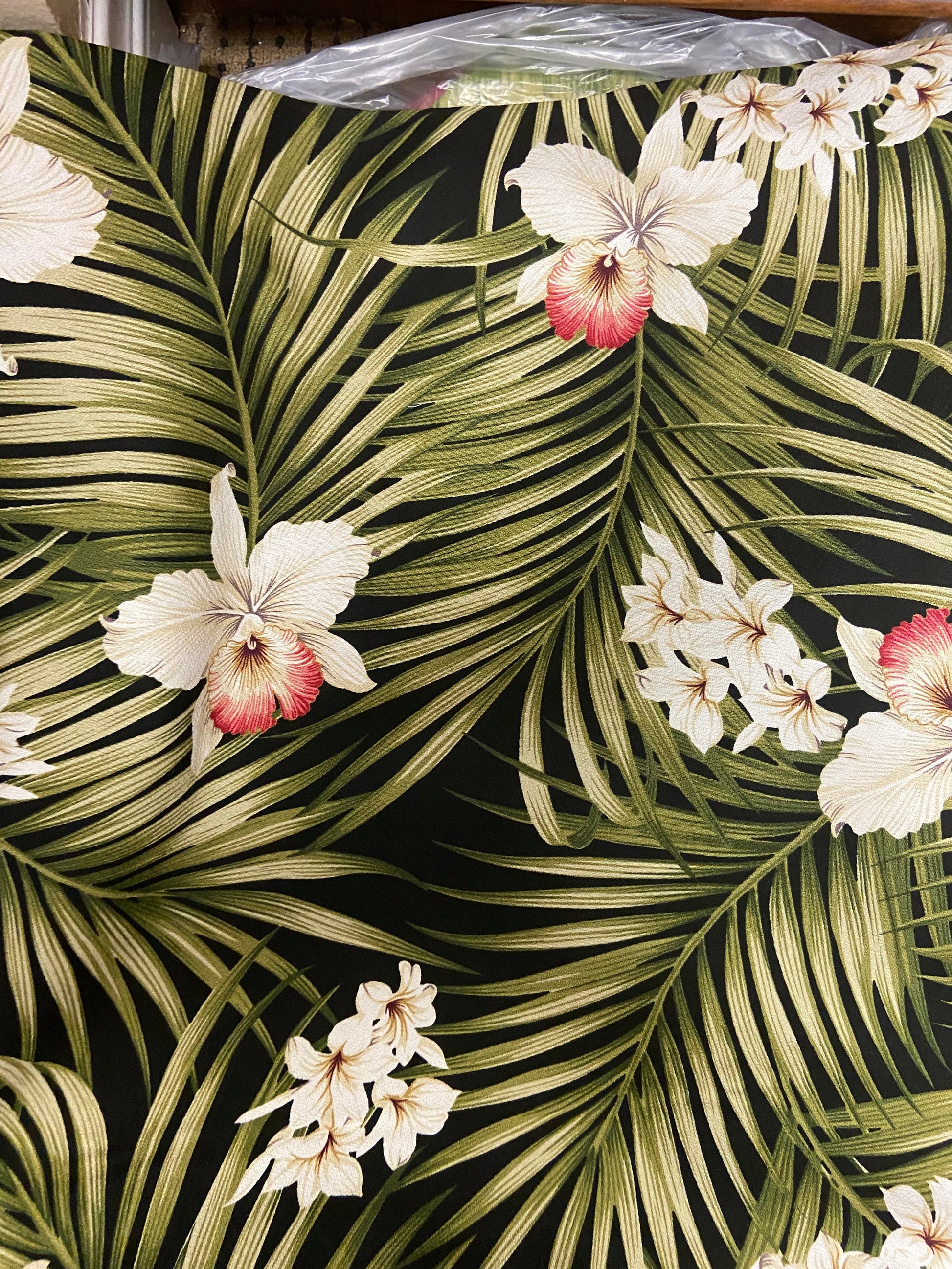 Even more beautiful that the picture can capture, Kona is simply a stunning combo. Mix with Maui and deep pink and you have a story everyone will admire. This pillow is 24" x 24" when measured flat with no filling. With filling it is 6" deep. It contains feather and down filling and is made in America. Bright floral pattern with pink, white and green on a black background
