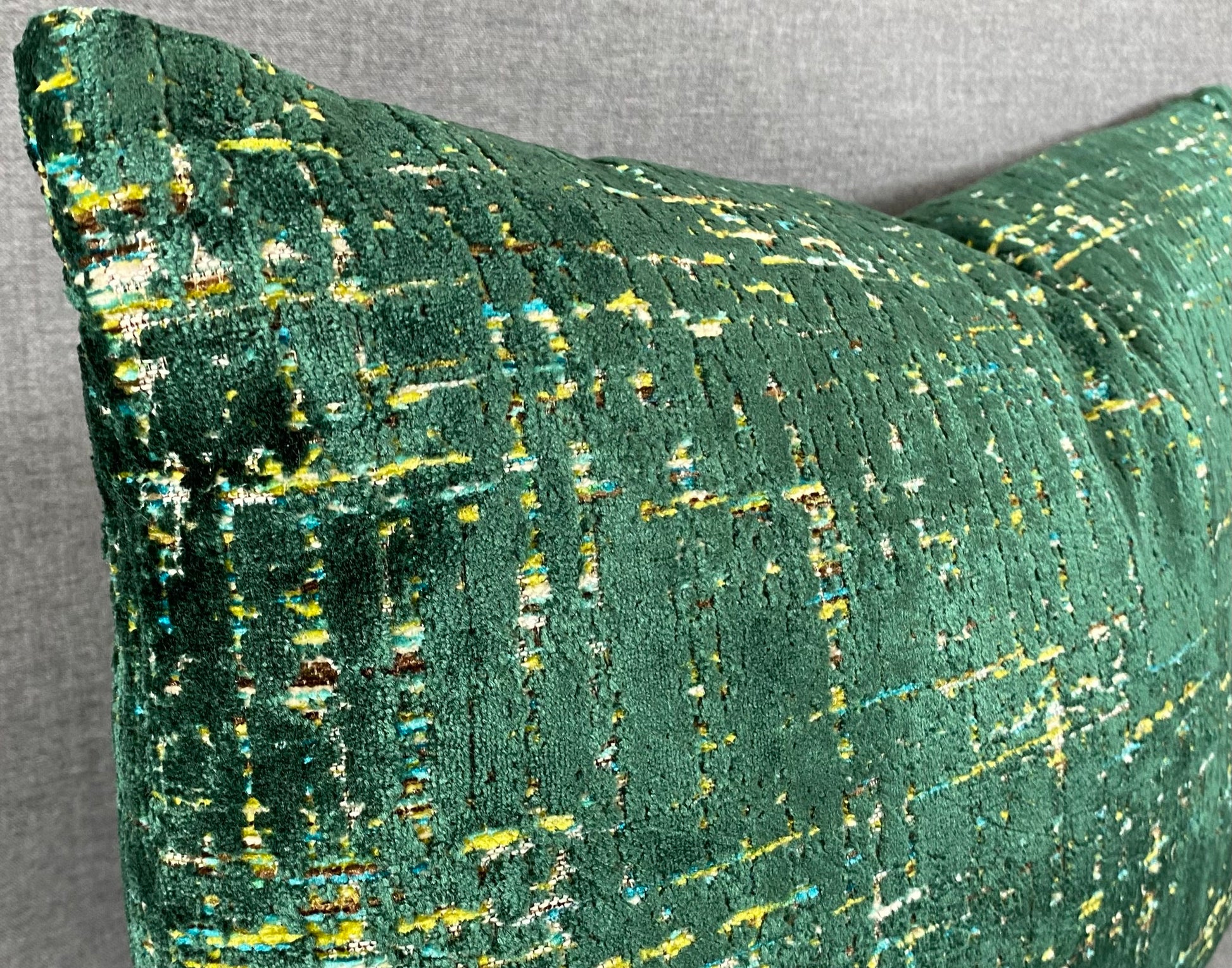 This pillow is 24" x 14" when measured flat with no filling. With filling it is 6" deep. It contains feather and down filling and is made in America. Lush velvet in a glowing emerald with yellow peaking from underneath