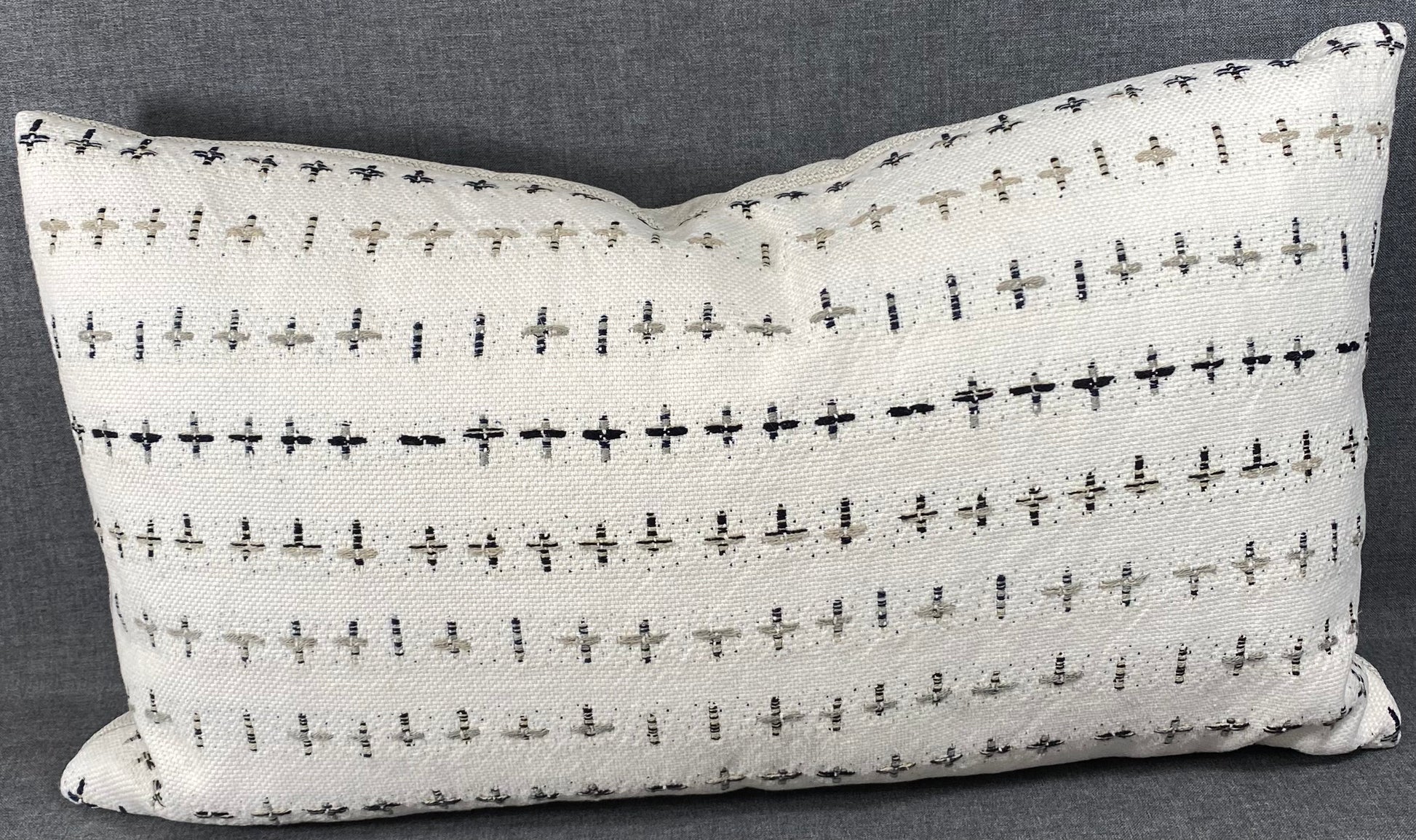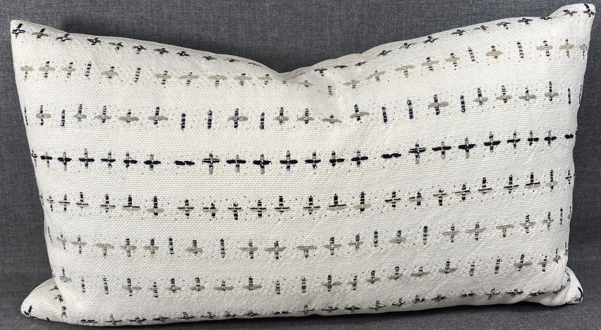 This pillow is 24" x 14" when measured flat with no filling. With filling it is 6" deep. It contains feather and down filling and is made in America. Cross stitch pattern of blue and white on a tan background. back is a tan fabric