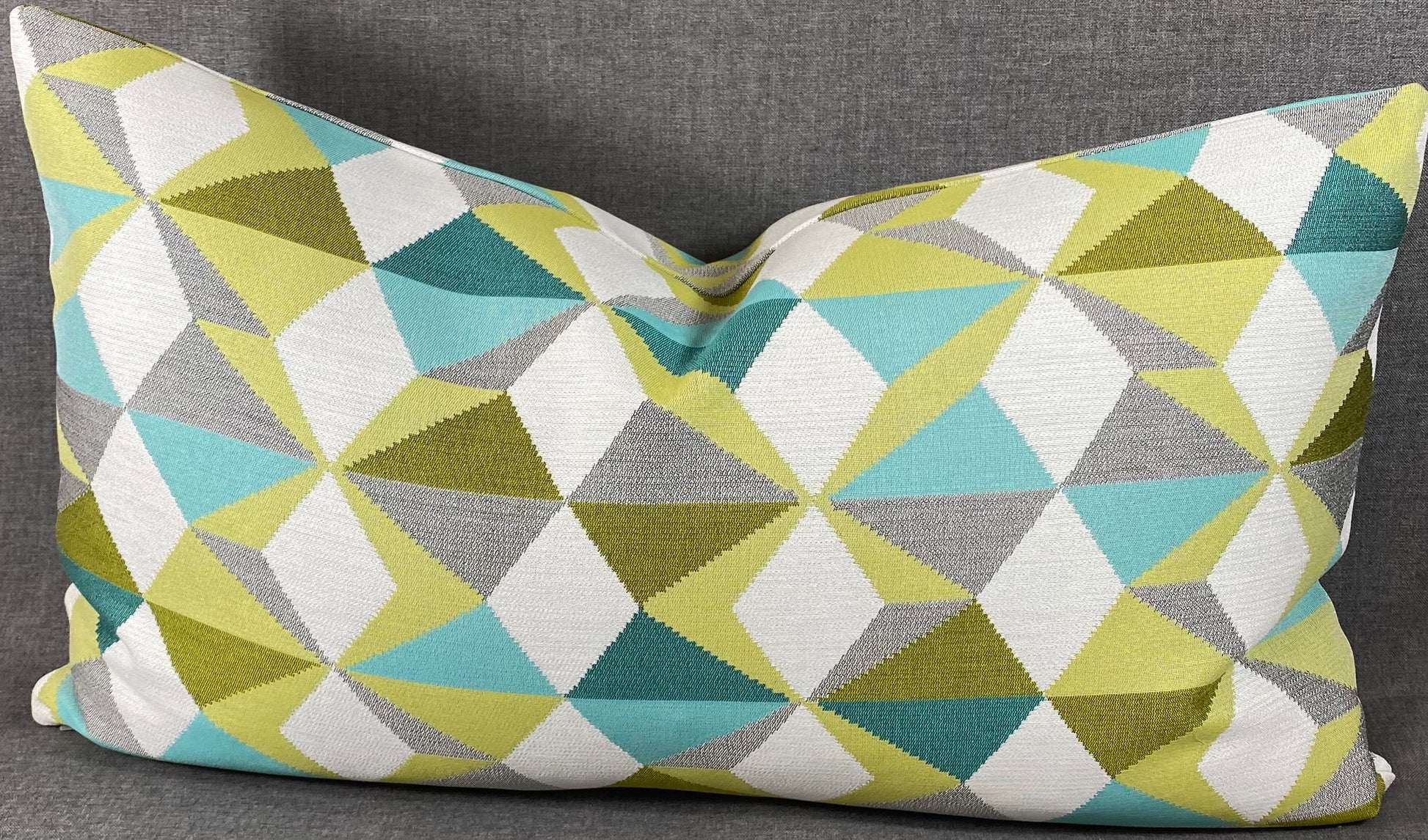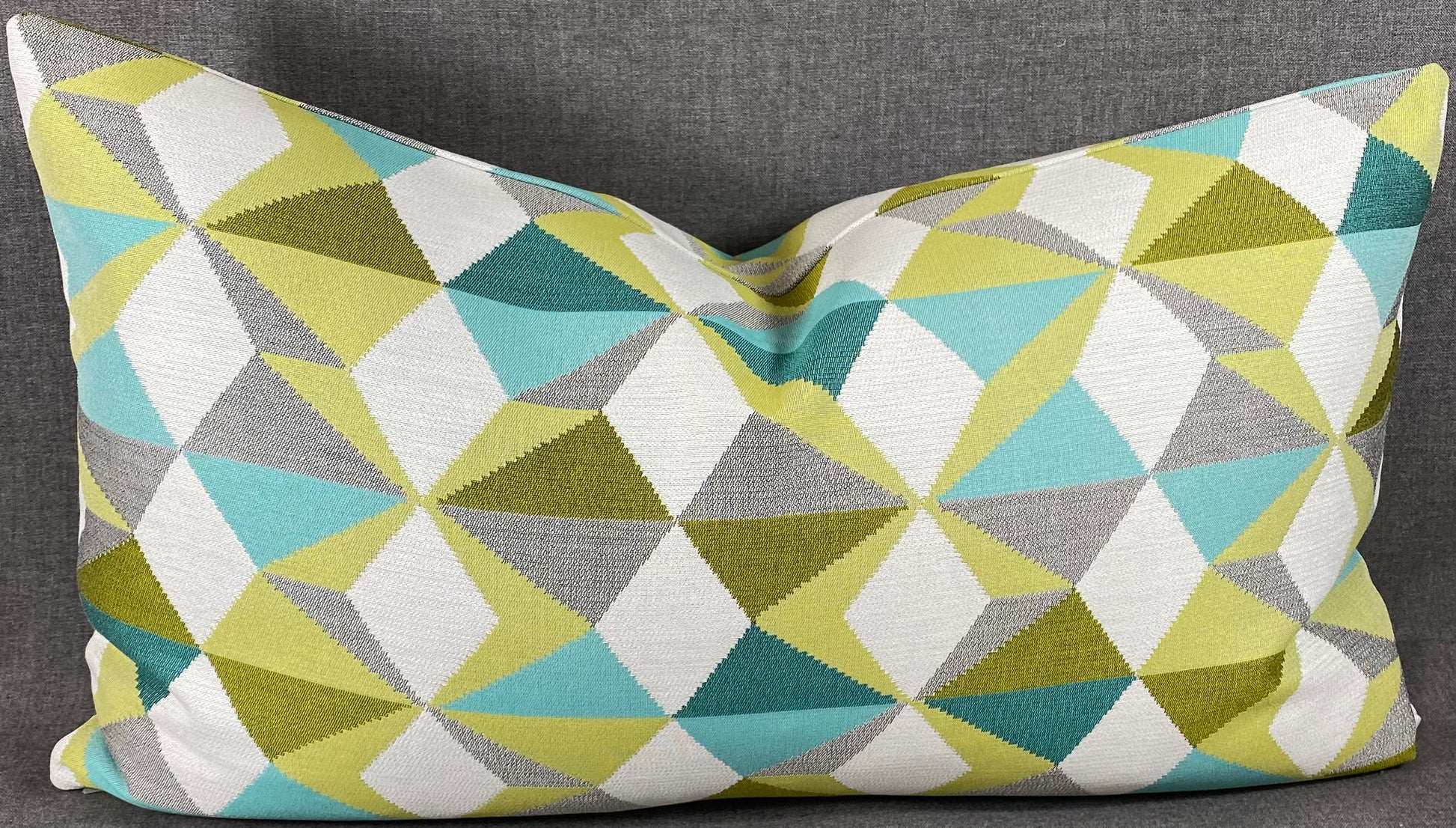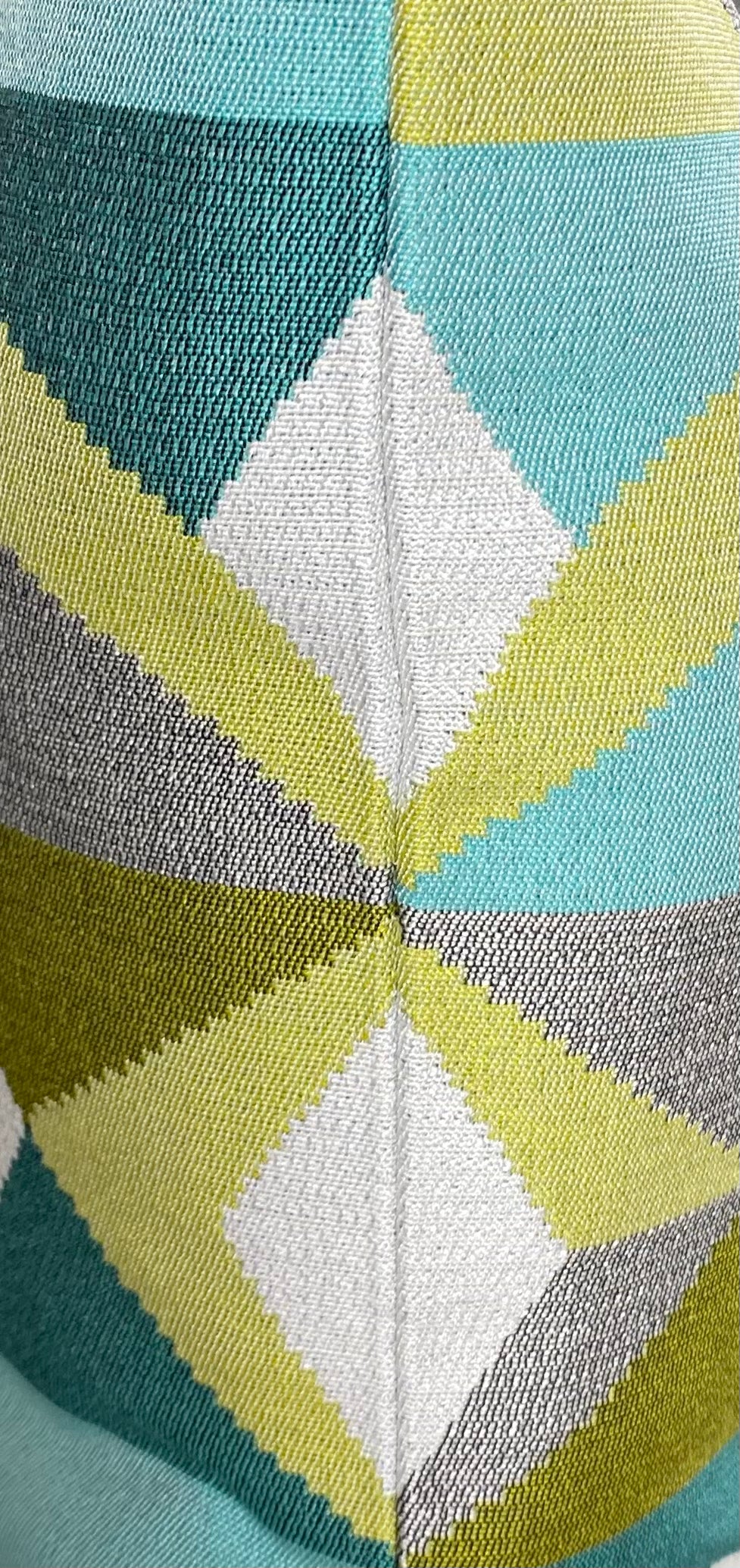 This pillow is 24" x 14" when measured flat with no filling. With filling it is 6" deep. It contains feather and down filling and is made in America. A classic Palm Springs color pallet of lime, teal, turquoise, and gray on a bright white background in a modernistic geometric pattern