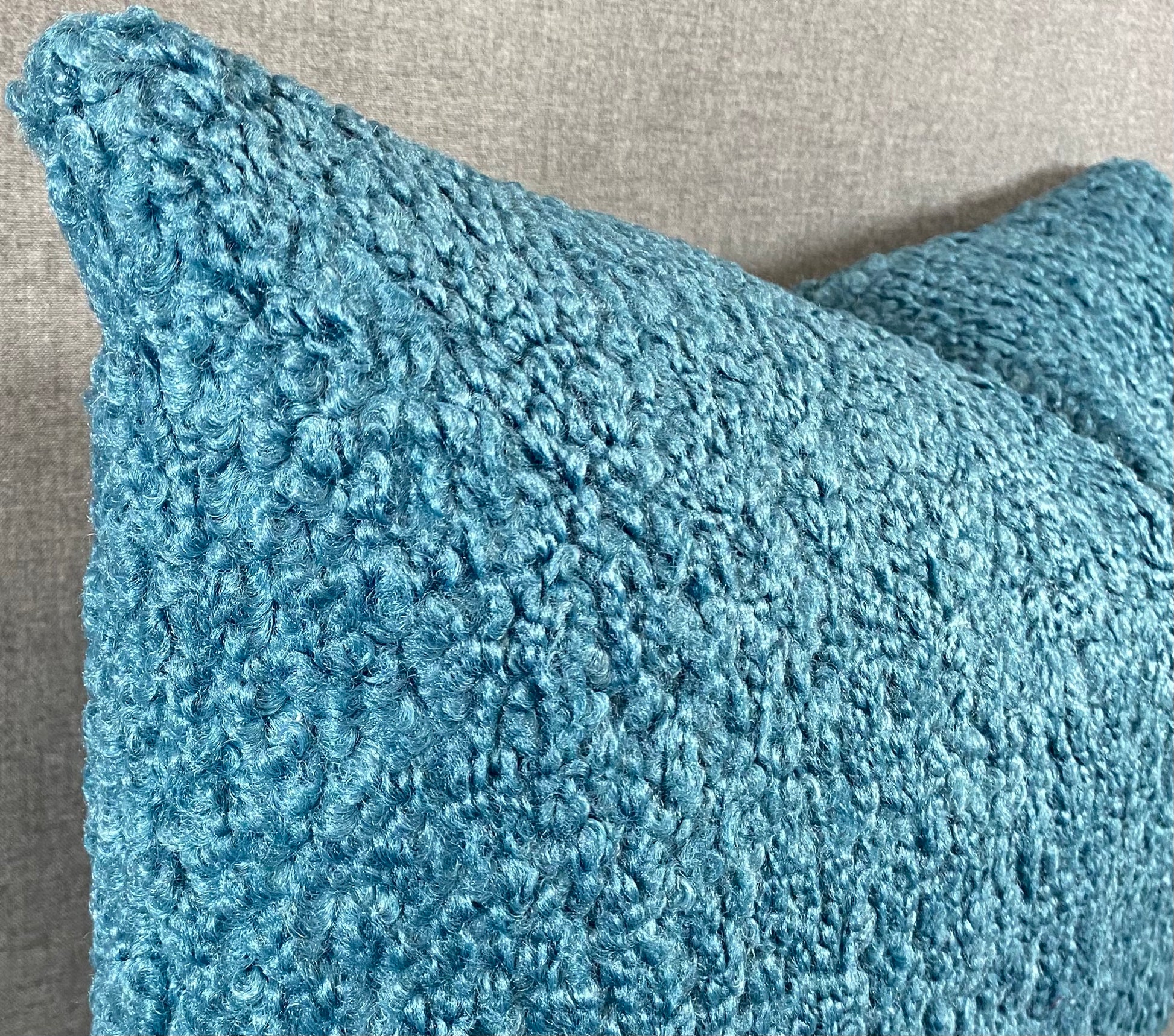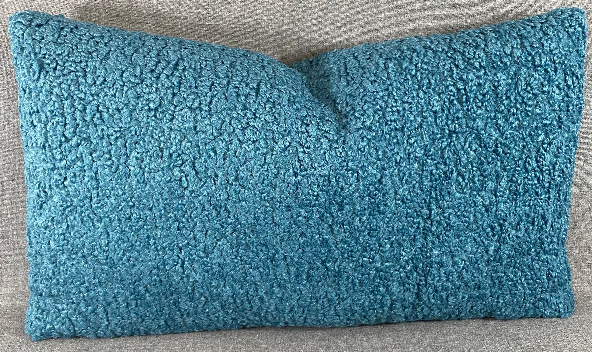 This pillow is 24" x 14" when measured flat with no filling. With filling it is 6" deep. It contains feather and down filling and is made in America. Teal poodle like fur